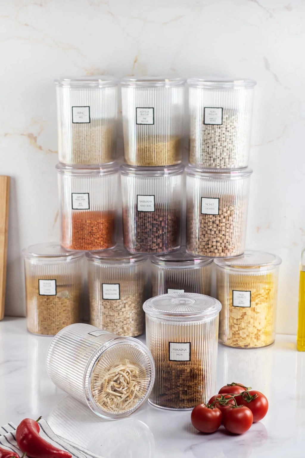 Erzak veya depolamak istediğiniz her ürünü saklamak için 12 adet büyük boydan oluşan estetik akrilik kavanoz seti depolama yapmak için en ideal tercihiniz olacak.