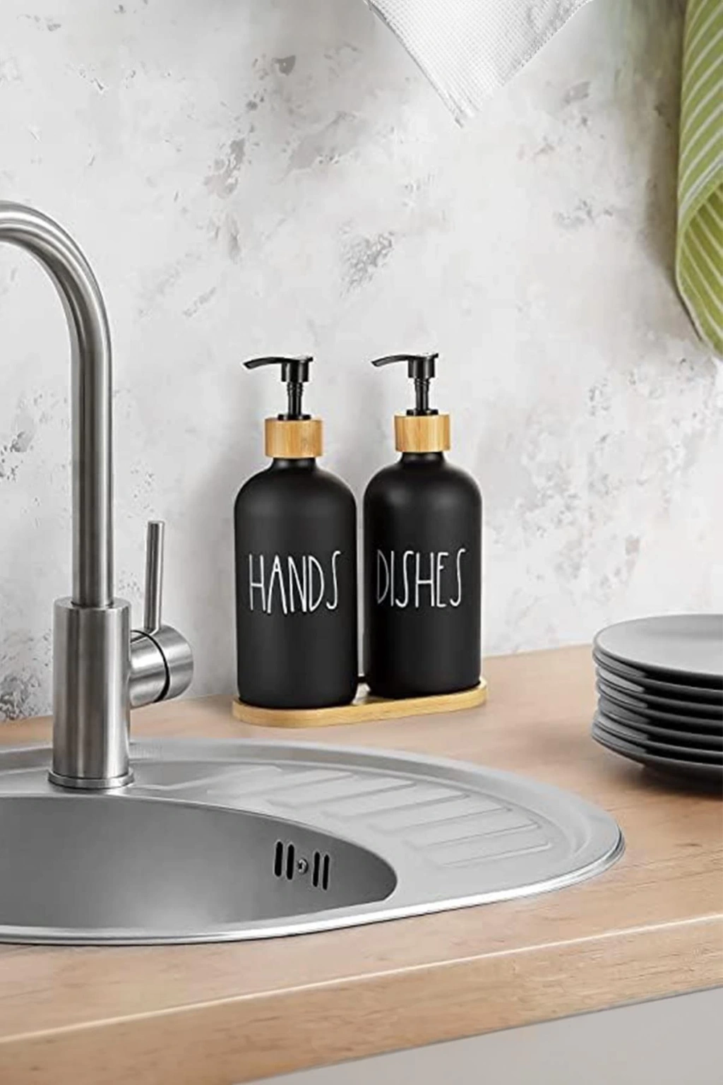 2 Li Bambu Altlıklı Sıvı Sabunluk Seti Siyah
