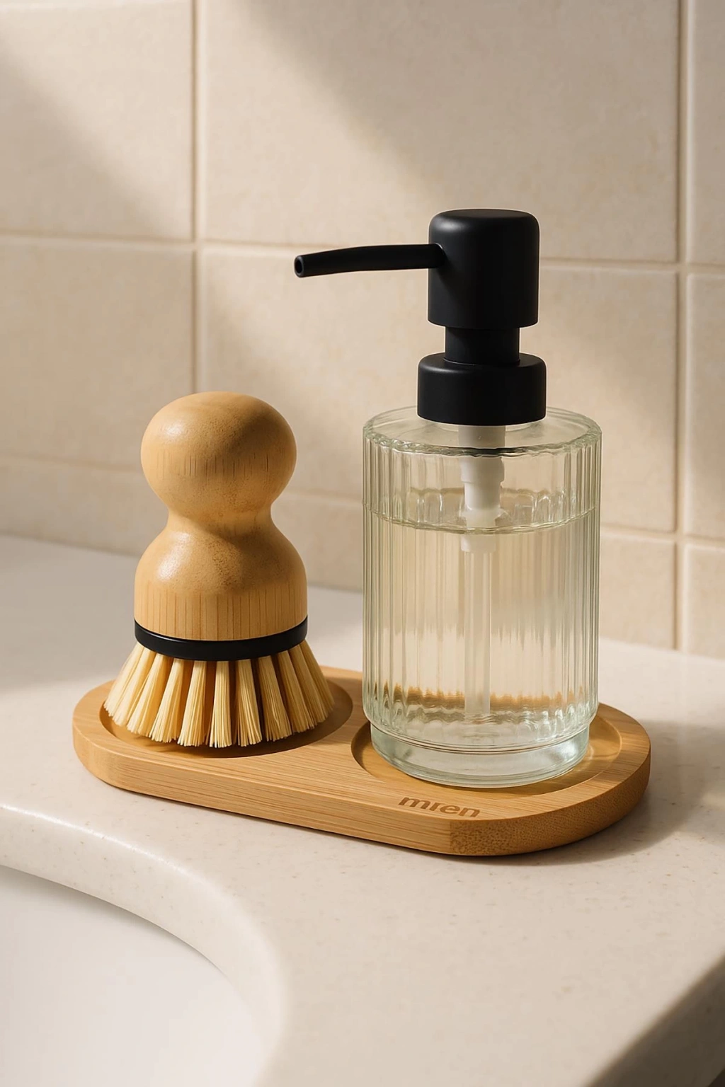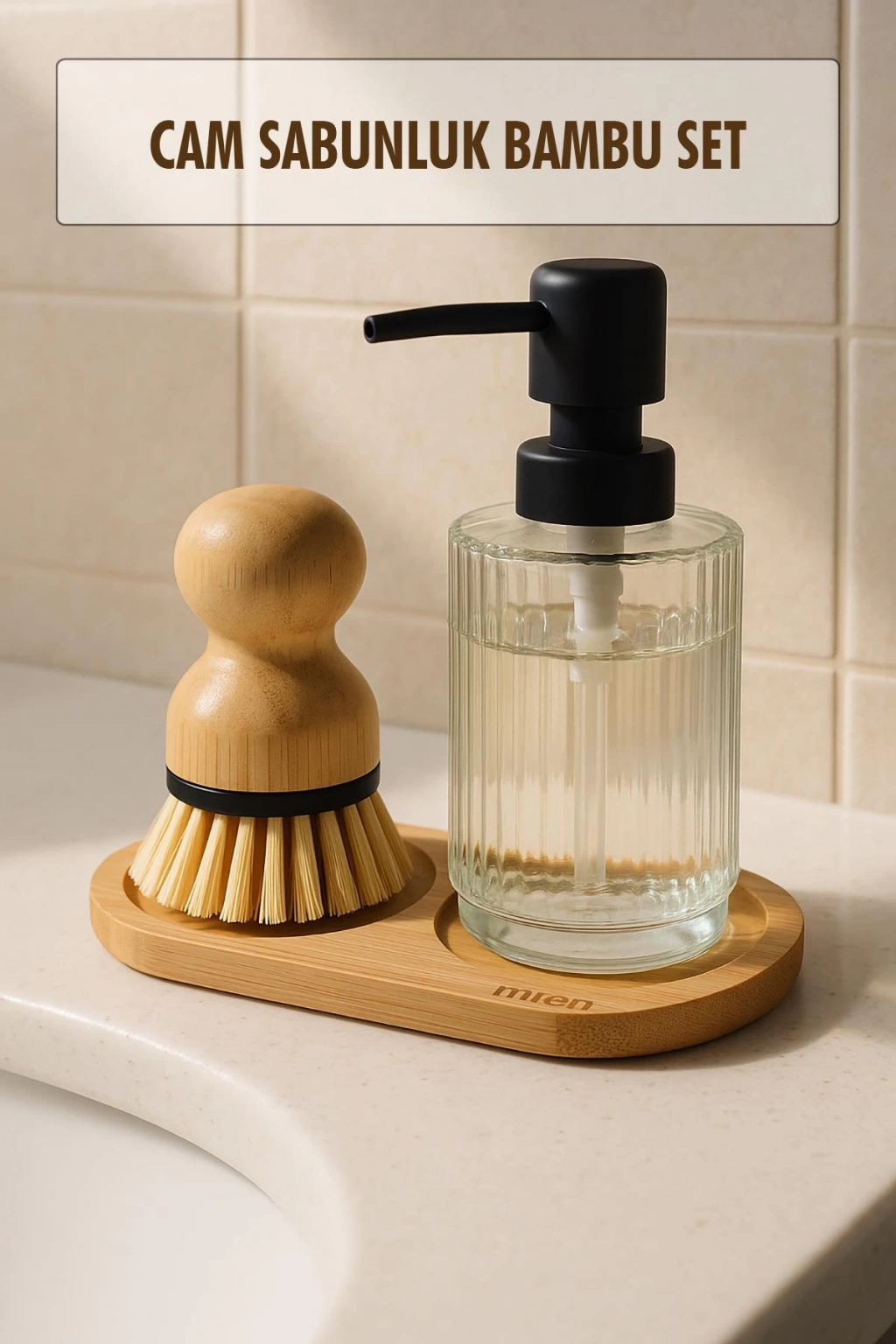 Ürün Hikayesi: Şık ve doğal tasarımıyla banyonuza zarafet katan bu 3 parça set, bambu altlığı ve cam şeffaf sabunluğu ile modern bir görünüm sunar. Pratik temizlik fırçası ve sabunluk bir arada kullanılarak hem düzen hem de hijyen sağlar.