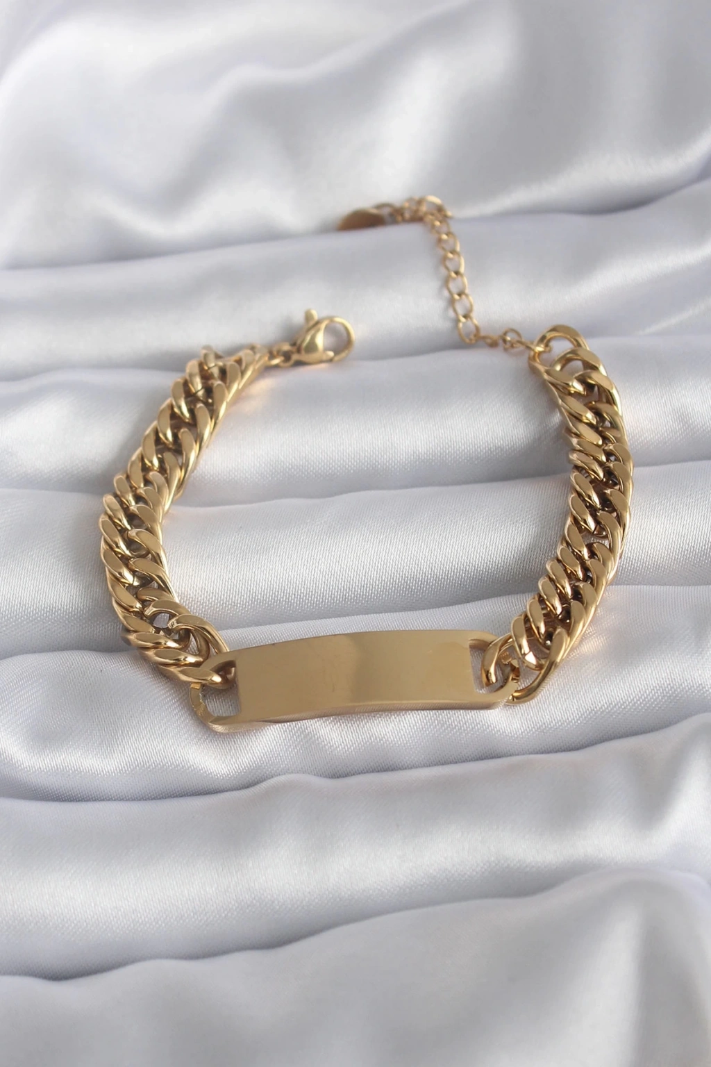 • 316L Çelik Gold Renk İsim Yazılabilir Plaka Model Kadın Bileklik