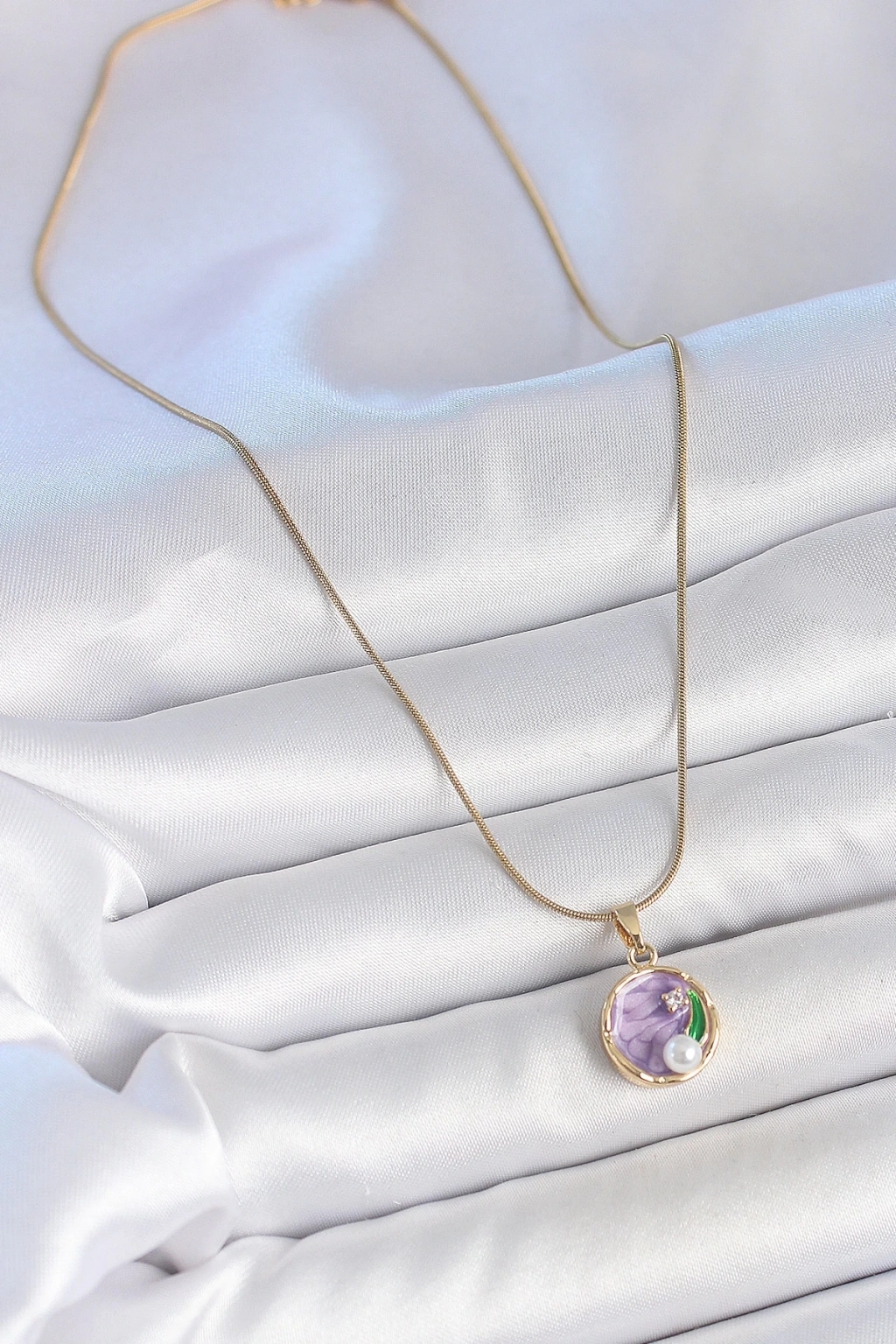 • 316L Çelik Gold Renk Zincir Mor Çiçek İşlemeli Zirkon Taş İnci Detaylı Minimal Portre Model Kadın Kolye