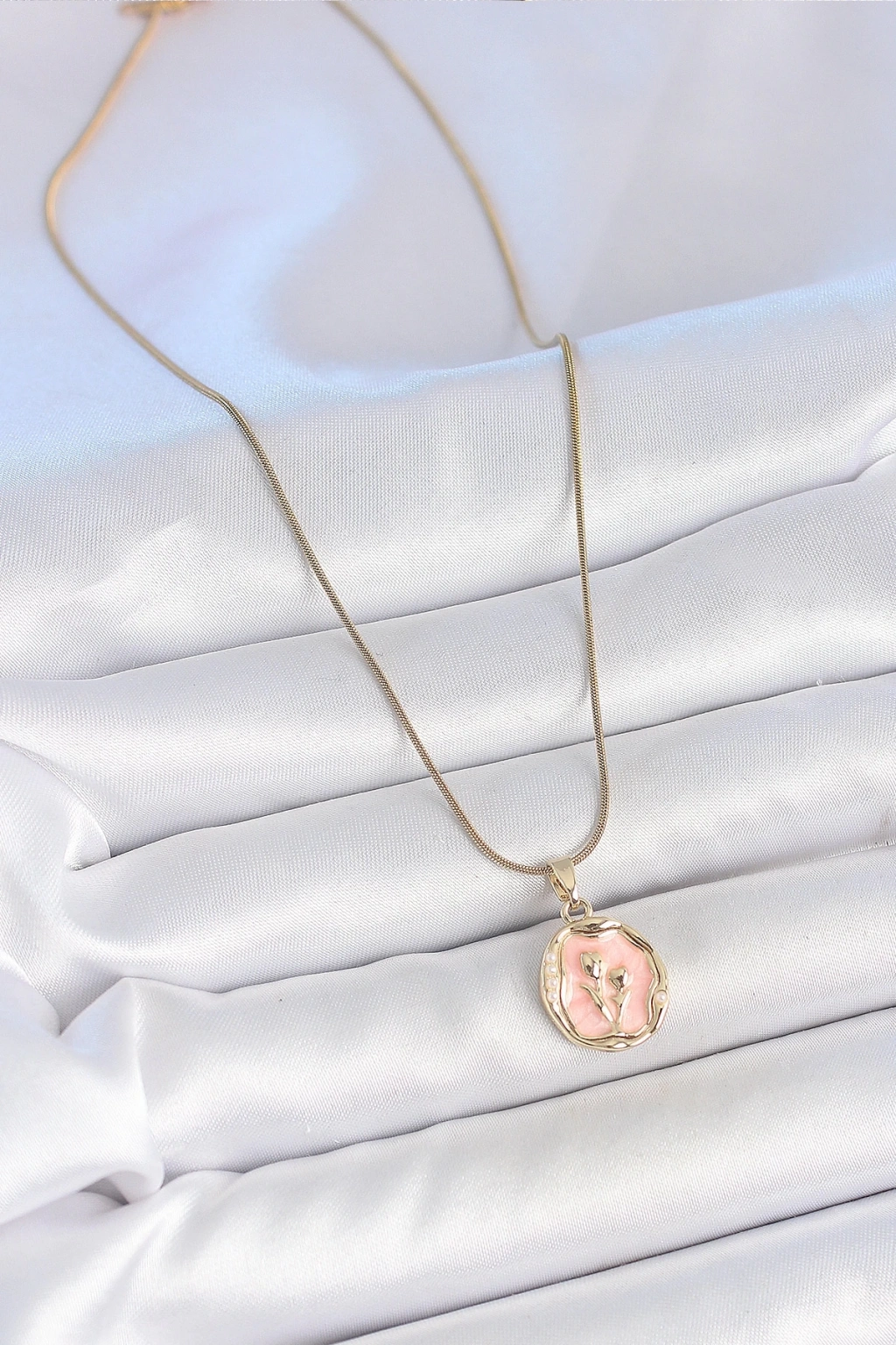 • 316L Çelik Gold Renk Zincir Pembe Mineli Çiçek İşlemeli Portre Model Kadın Kolye