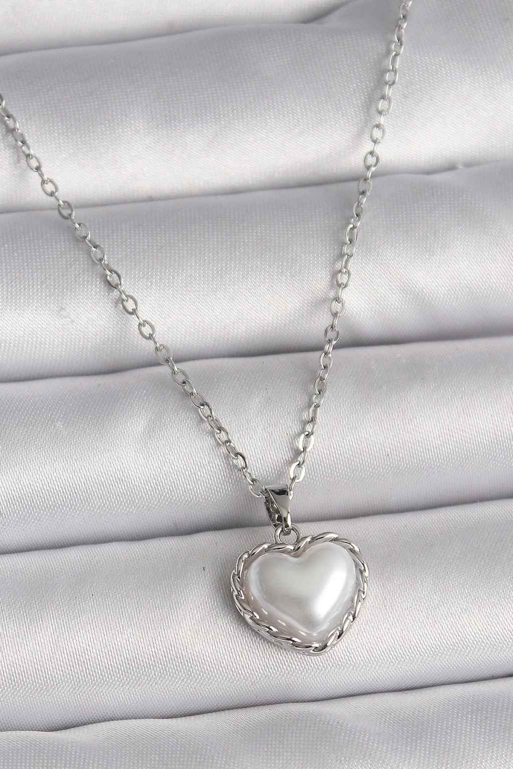 • 316L Çelik Gümüş Renk Zincir 3D İnci Kalp Model Kadın Kolye
