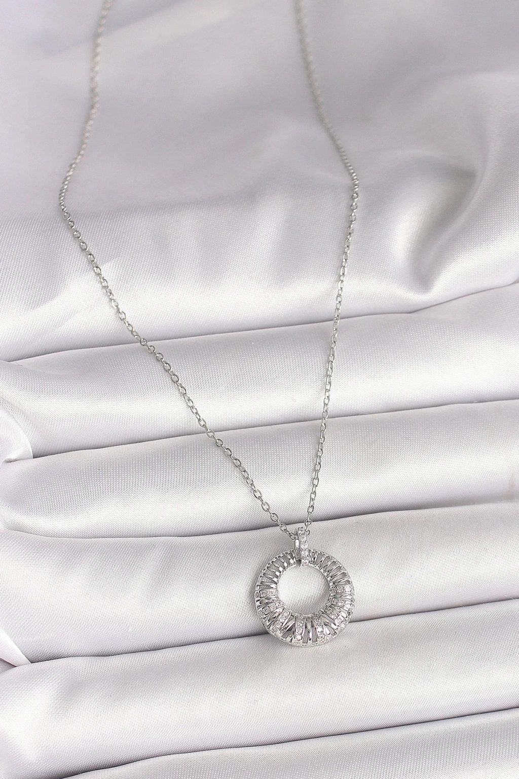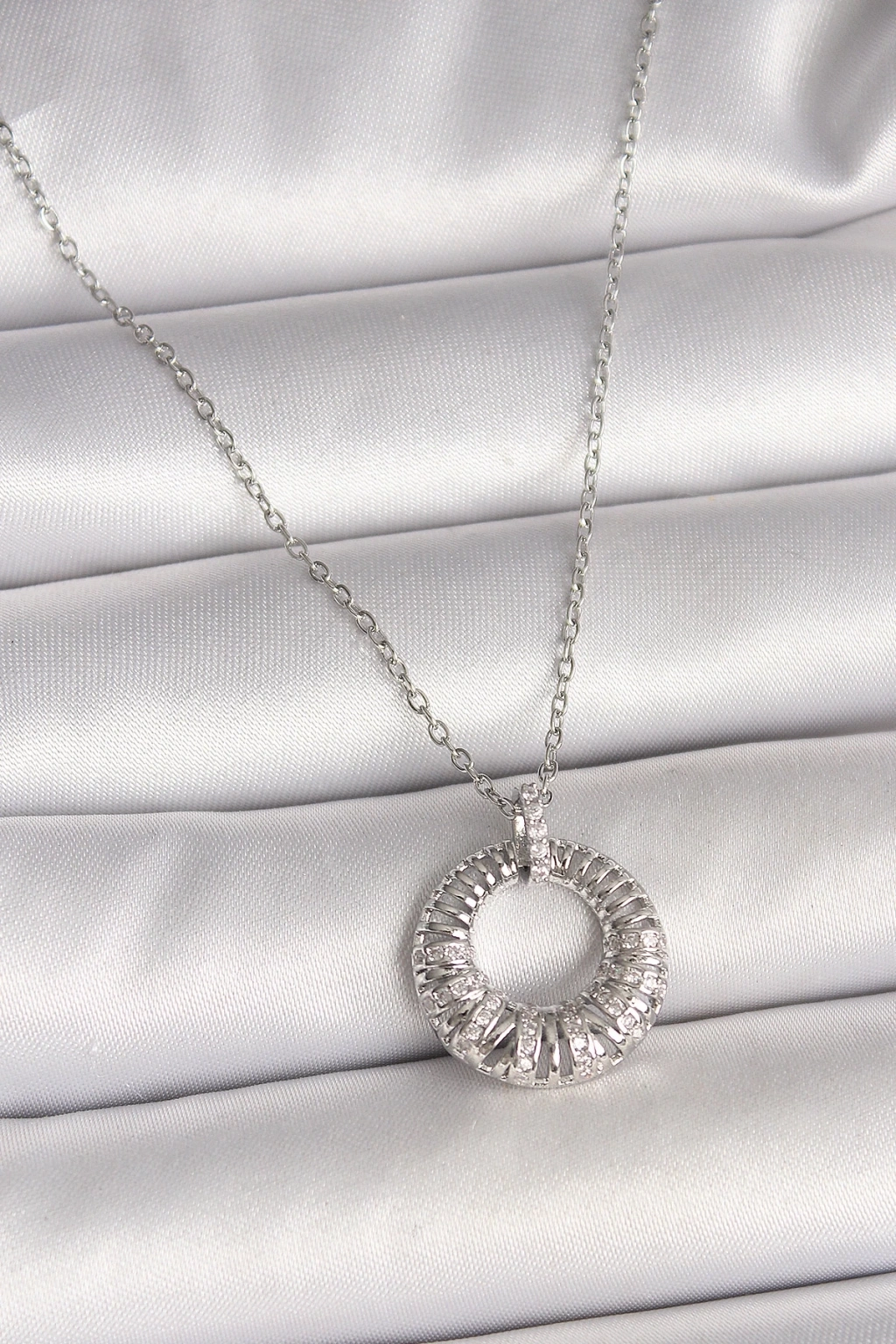 • 316L Çelik Gümüş Renk Zincir Zirkon Taş İşlemeli Daire Model Kadın Kolye