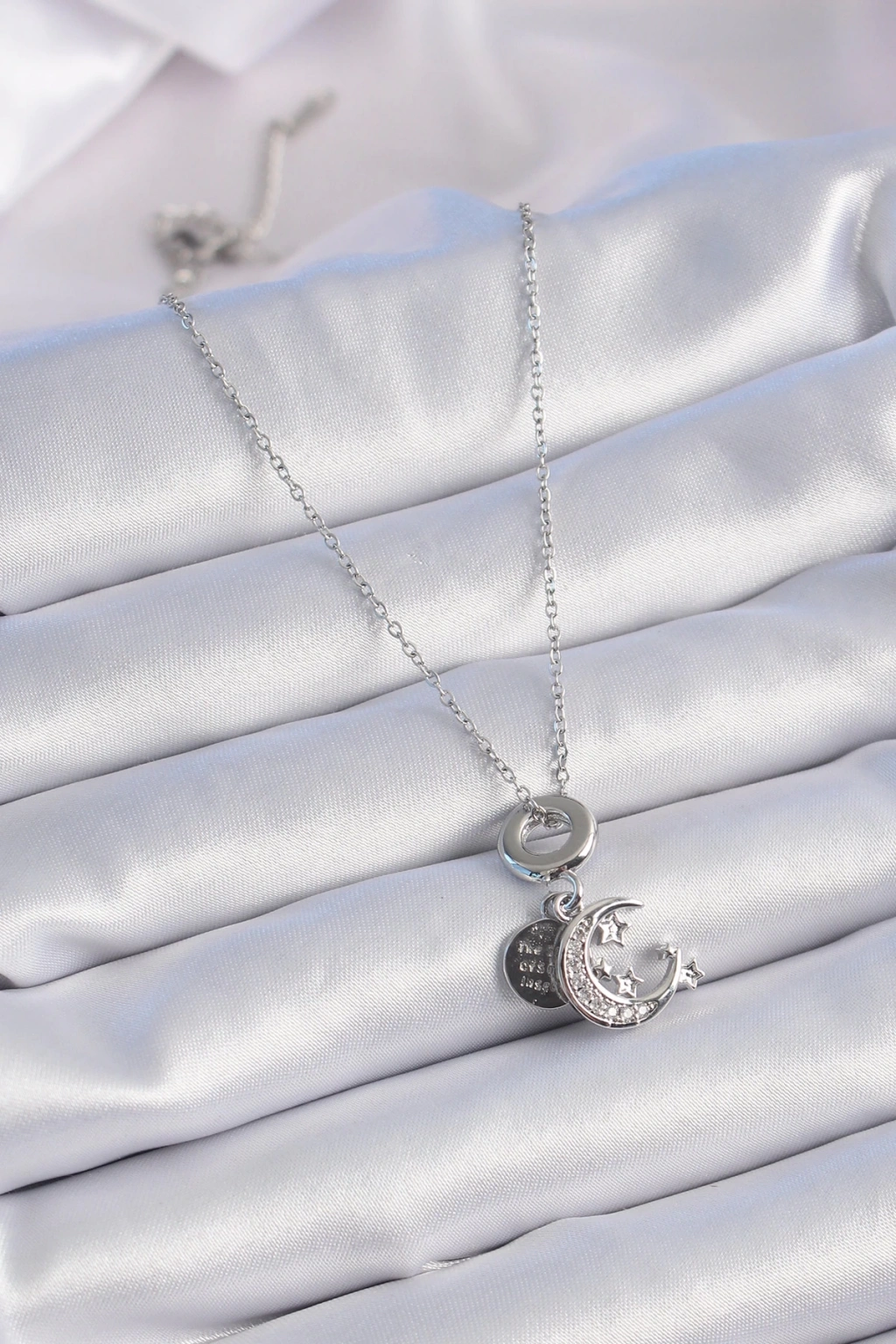 • 316L Çelik Gümüş Renk Zirkon Taşlı Ay Yıldız Figür Charm Model Kadın Kolye