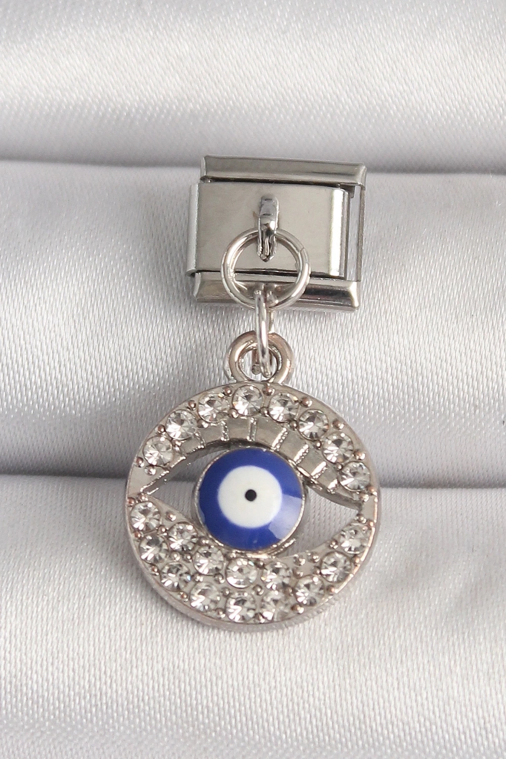 • 316L Çelik Gümüş Renk Zirkon Taşlı Göz Model Nazar Boncuk Detay Nomination Charm
