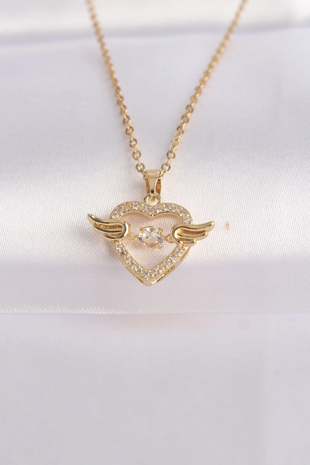 • 316L Çelik Zincir Altın Renk Zirkon Taşlı Kanatlı Kalp Kolye