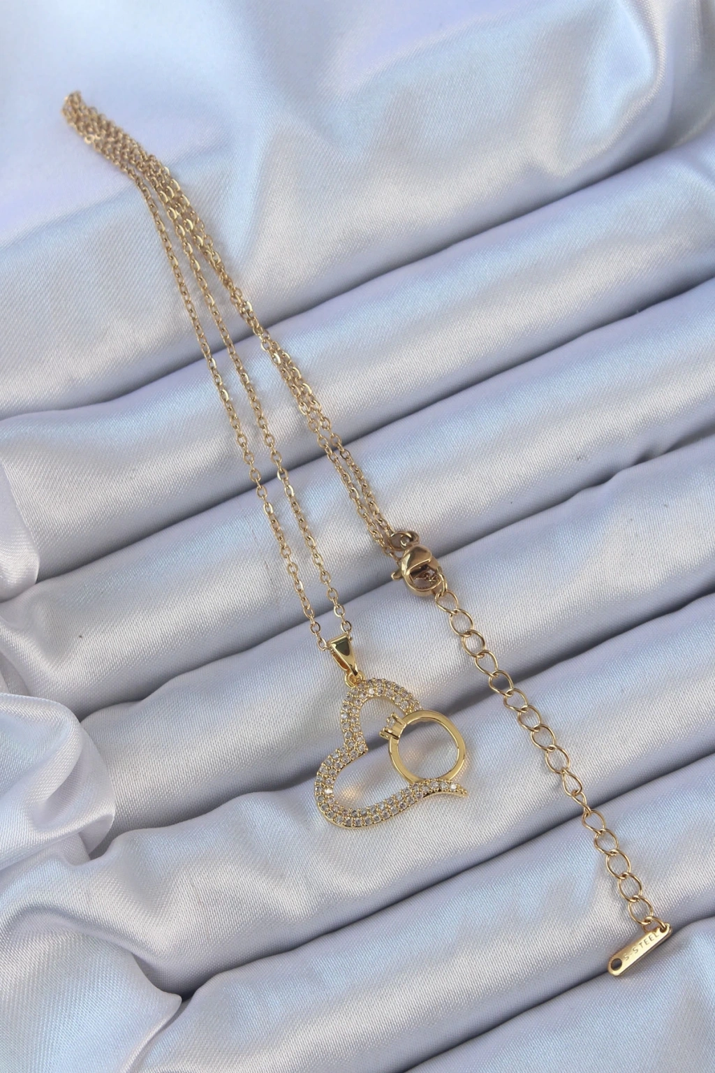 • 316L Çelik Zincir Altın Renk Zirkon Taşlı Yüzüklü Kalp Kolye