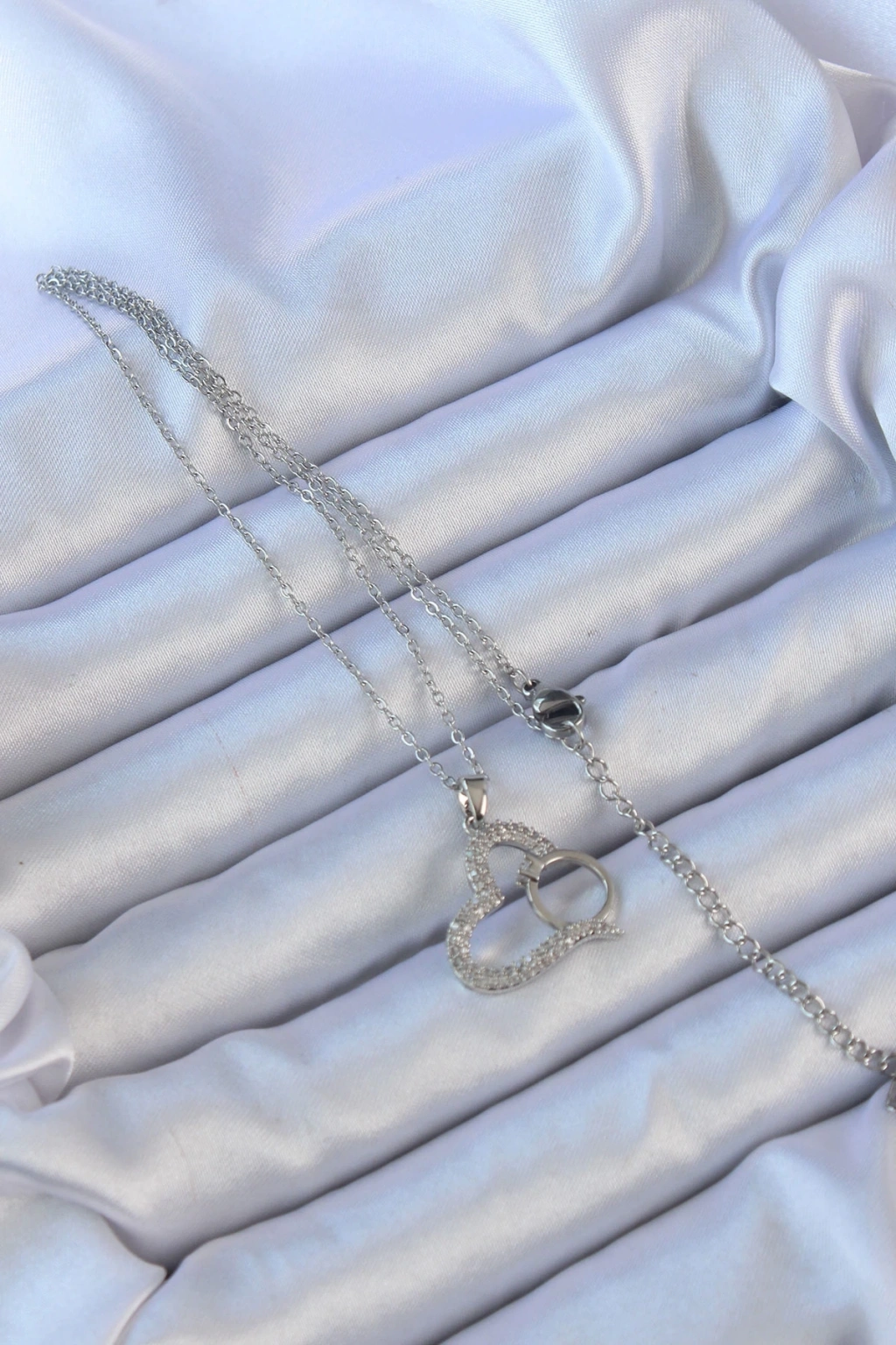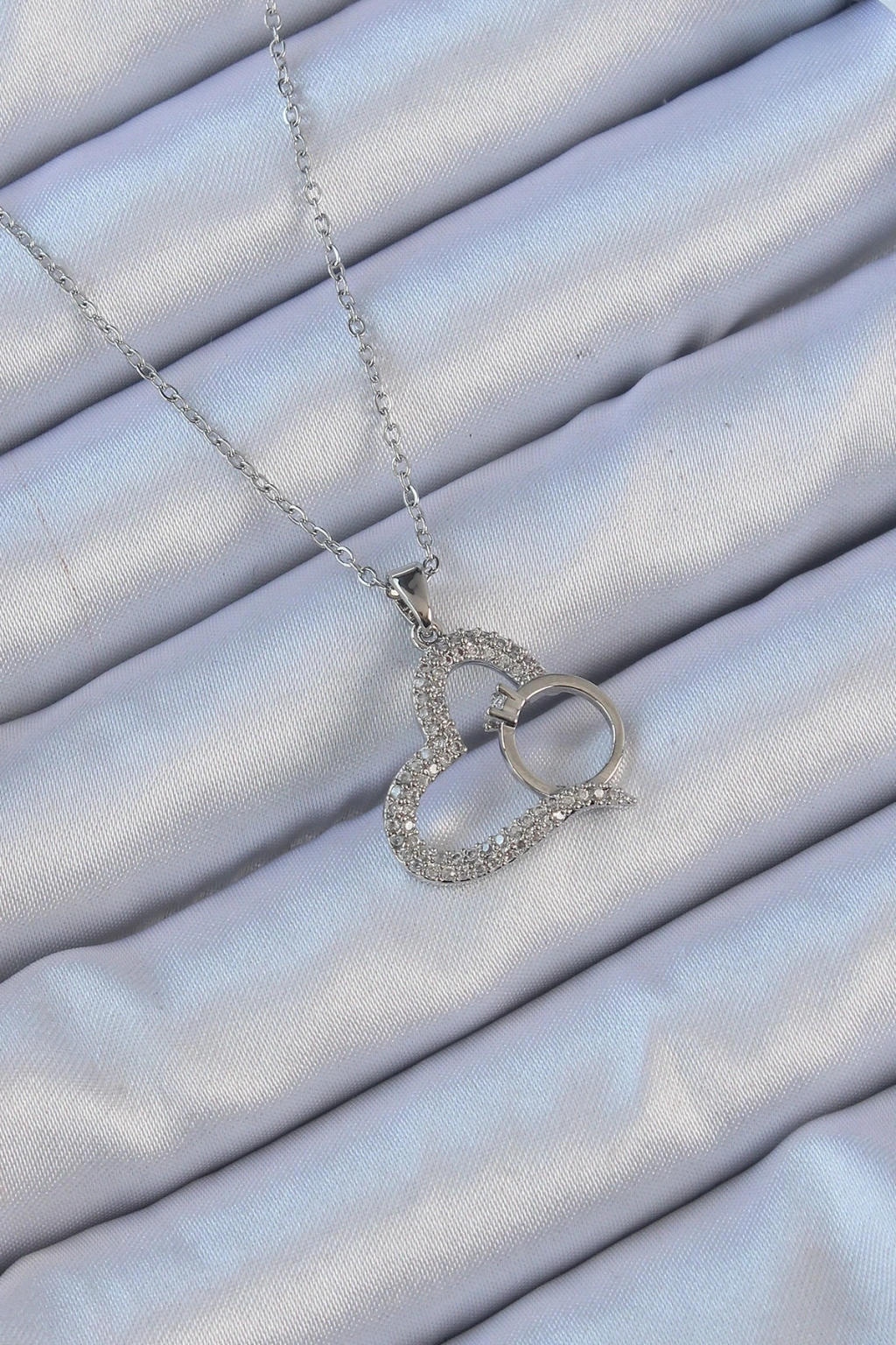 • 316L Çelik Zincir Gümüş Renk Zirkon Taşlı Yüzüklü Kalp Kolye