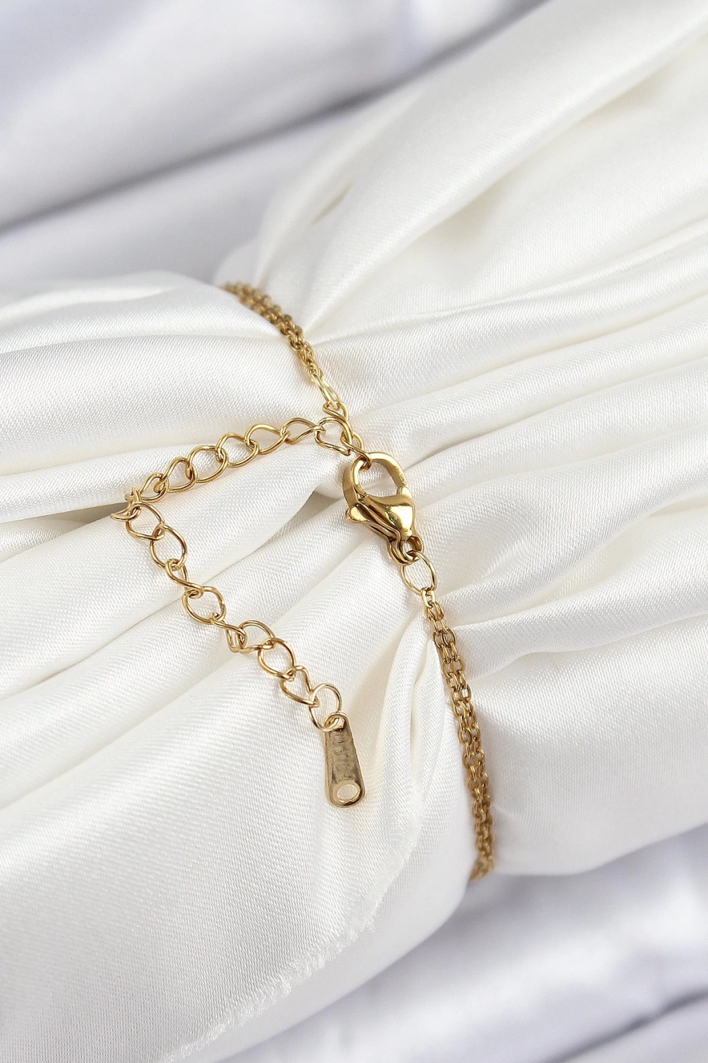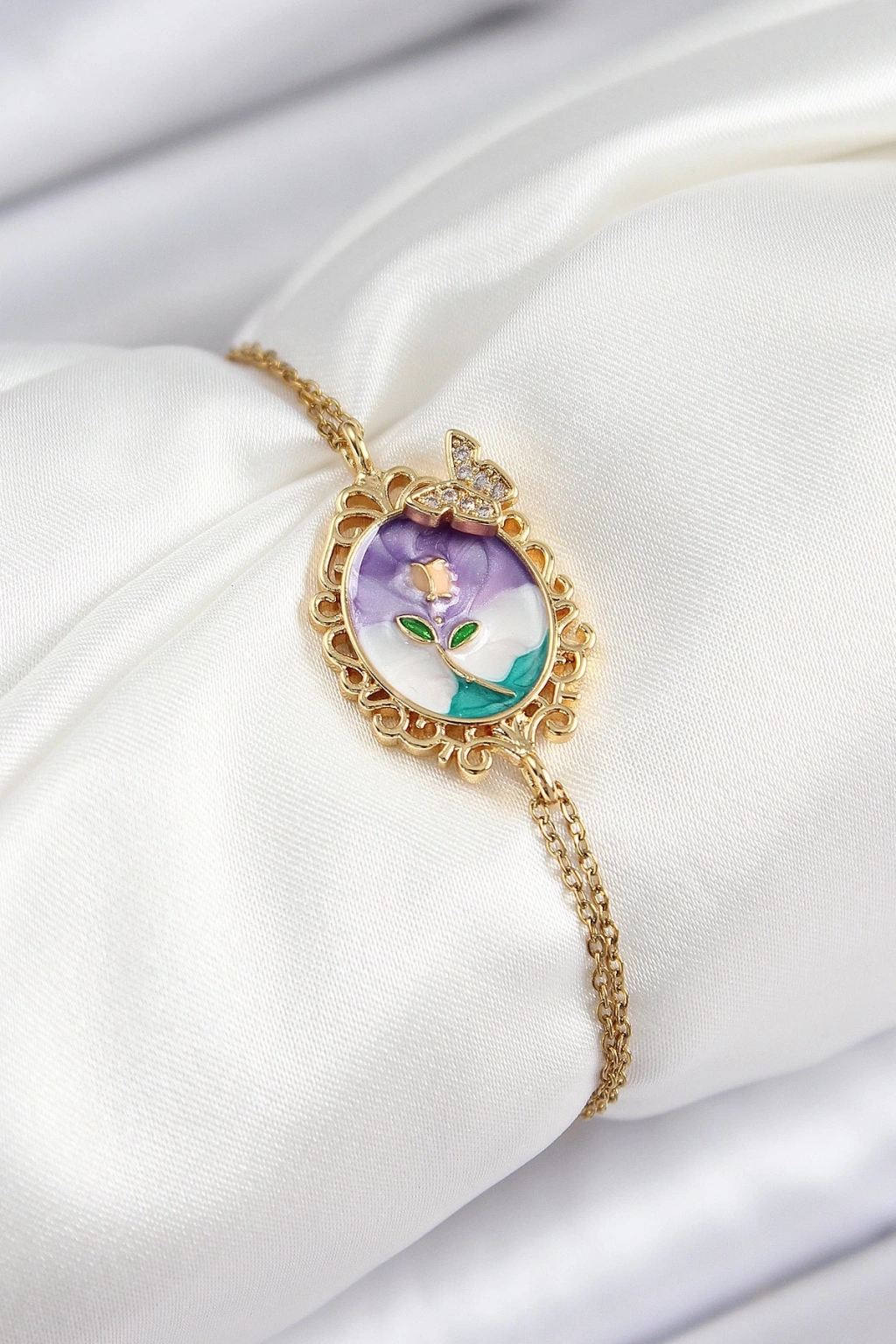 • 316L Çelik Zincir Mineli Sanatsal Portre Zirkon Taşlı Kelebek Detaylı Çiçek Model Gold Renk Kadın Bileklik