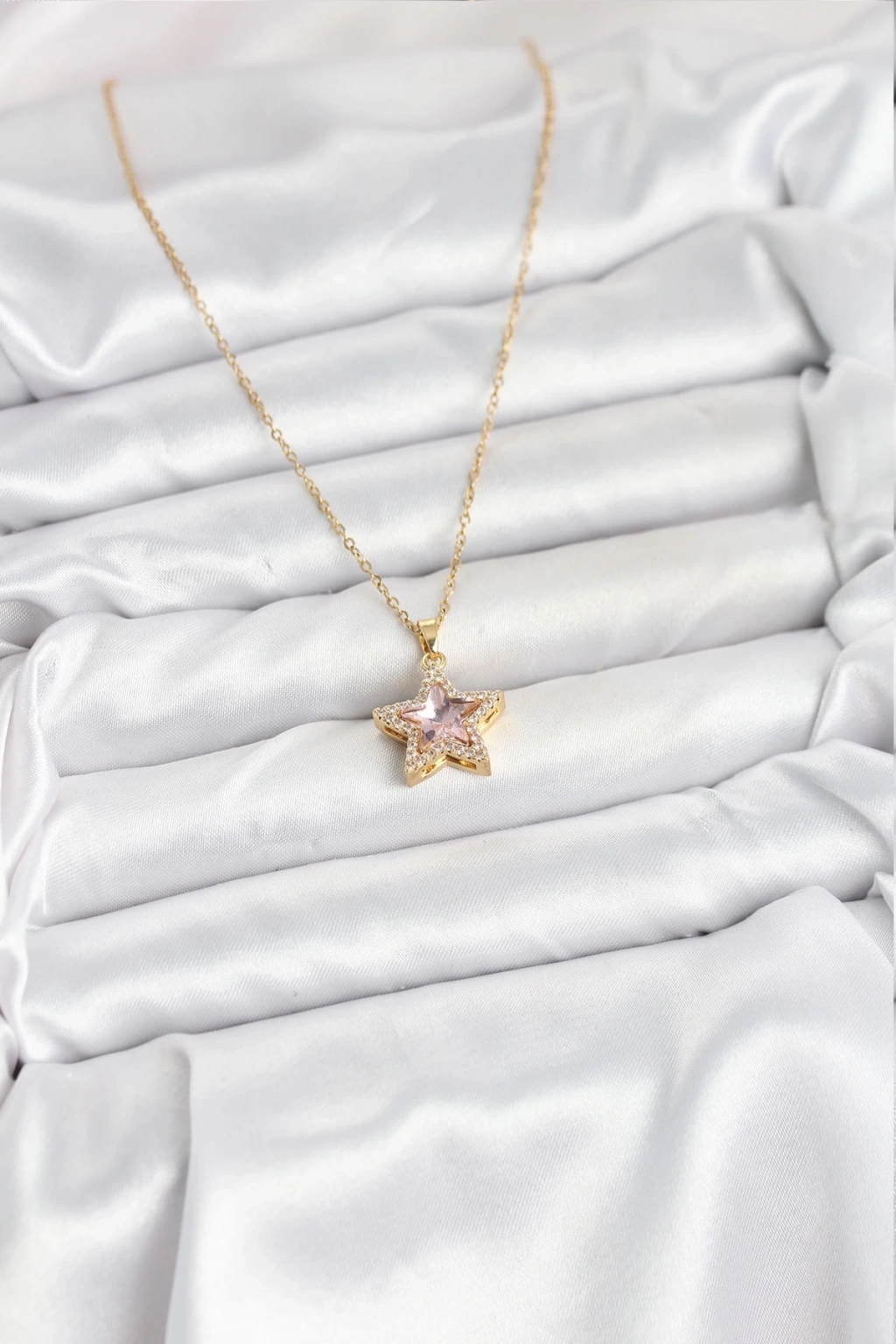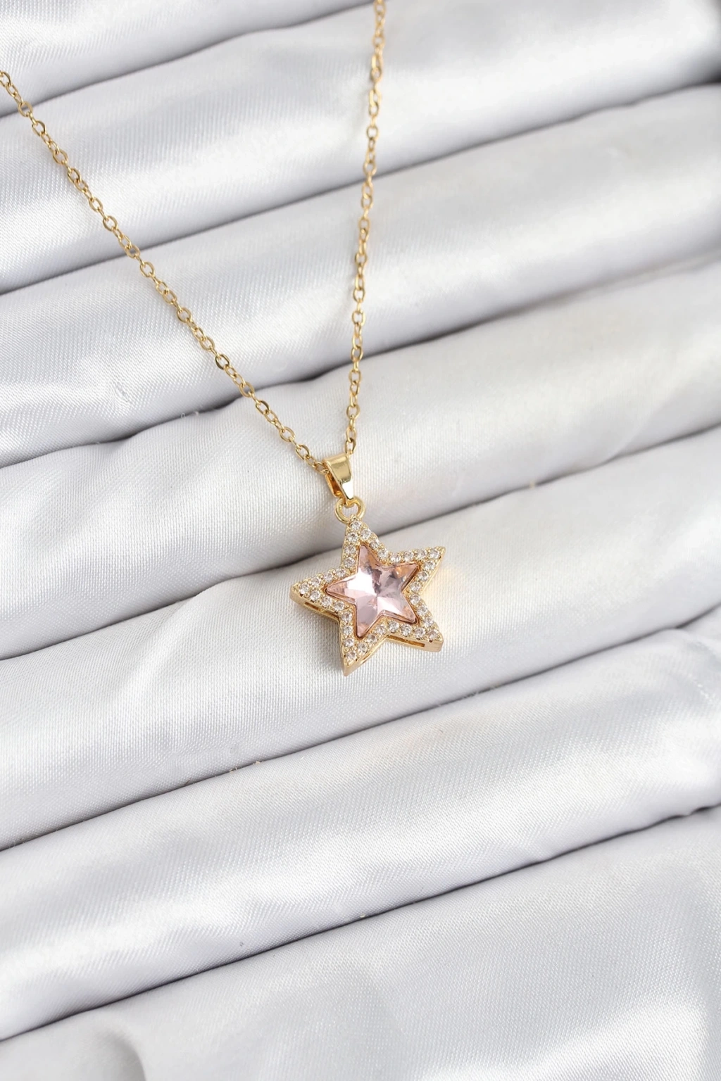 • 316L Çelik Zincir Pembe Taşlı Yıldız Model Kadın Kolye