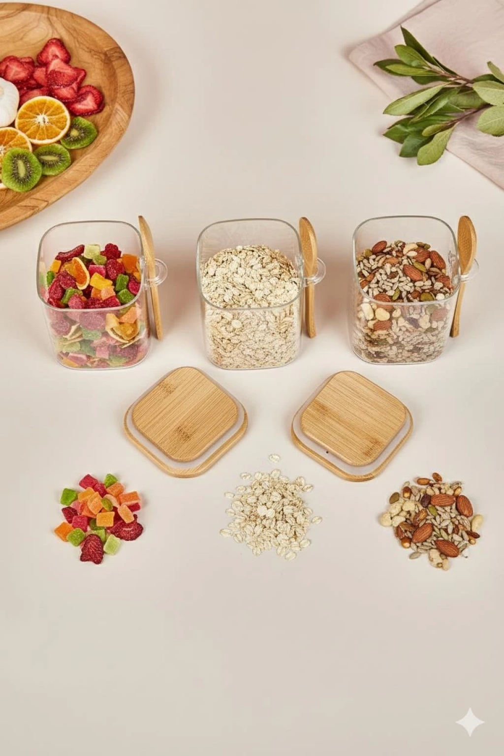 Pratik kullanımıyla mutfakta düzeni kolaylaştıran bu 3’lü cam kavanoz seti, yanında kaşıklı tasarımıyla öne çıkar. Baharat, kahve, şeker ve bakliyatlarınızı hijyenik ve şık bir şekilde saklamanıza yardımcı olur.