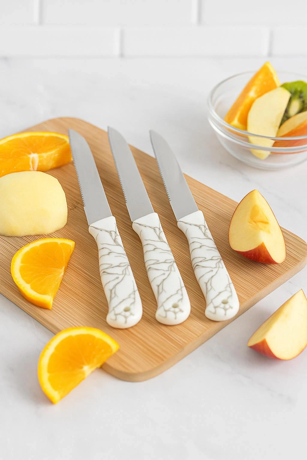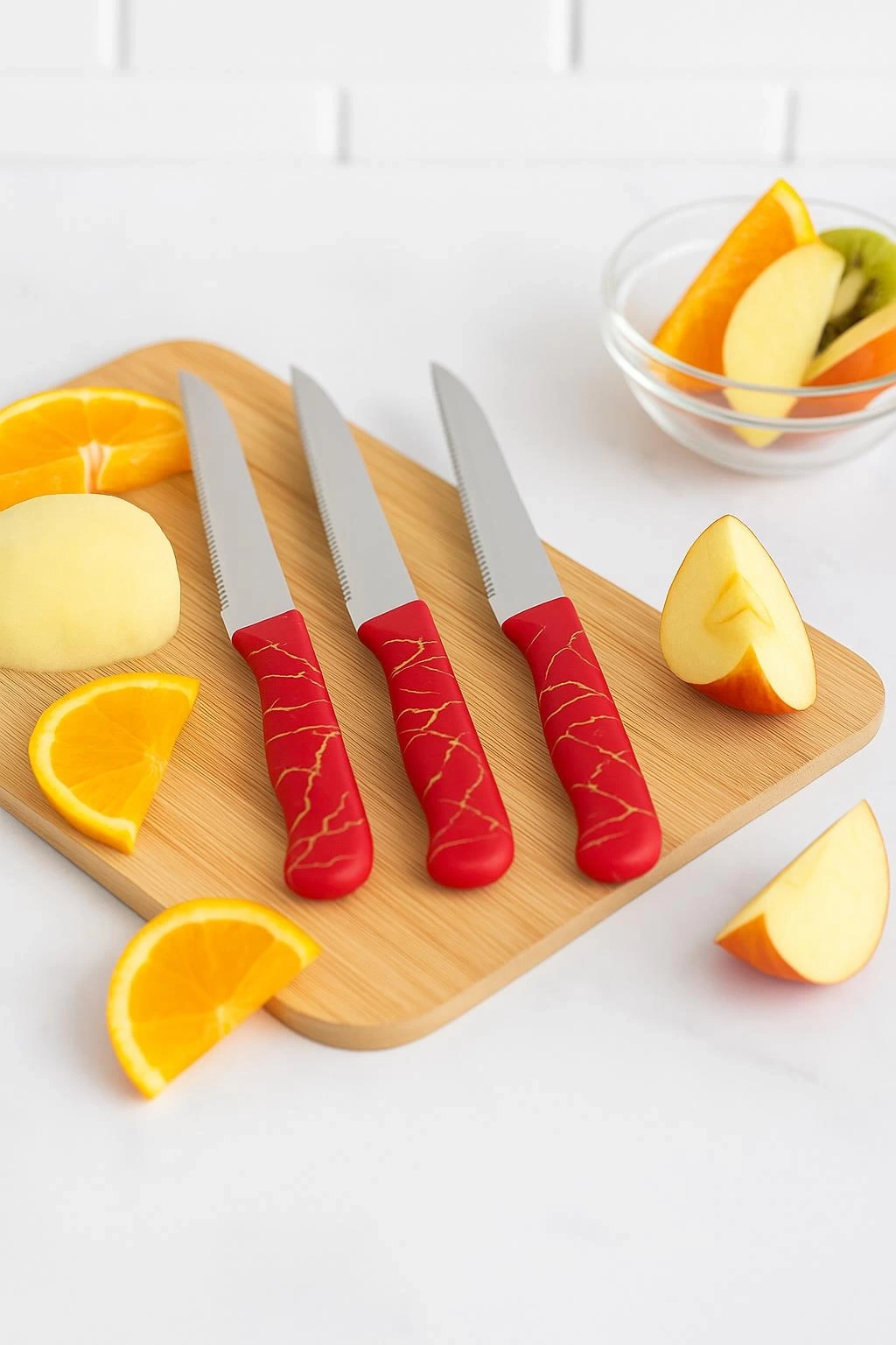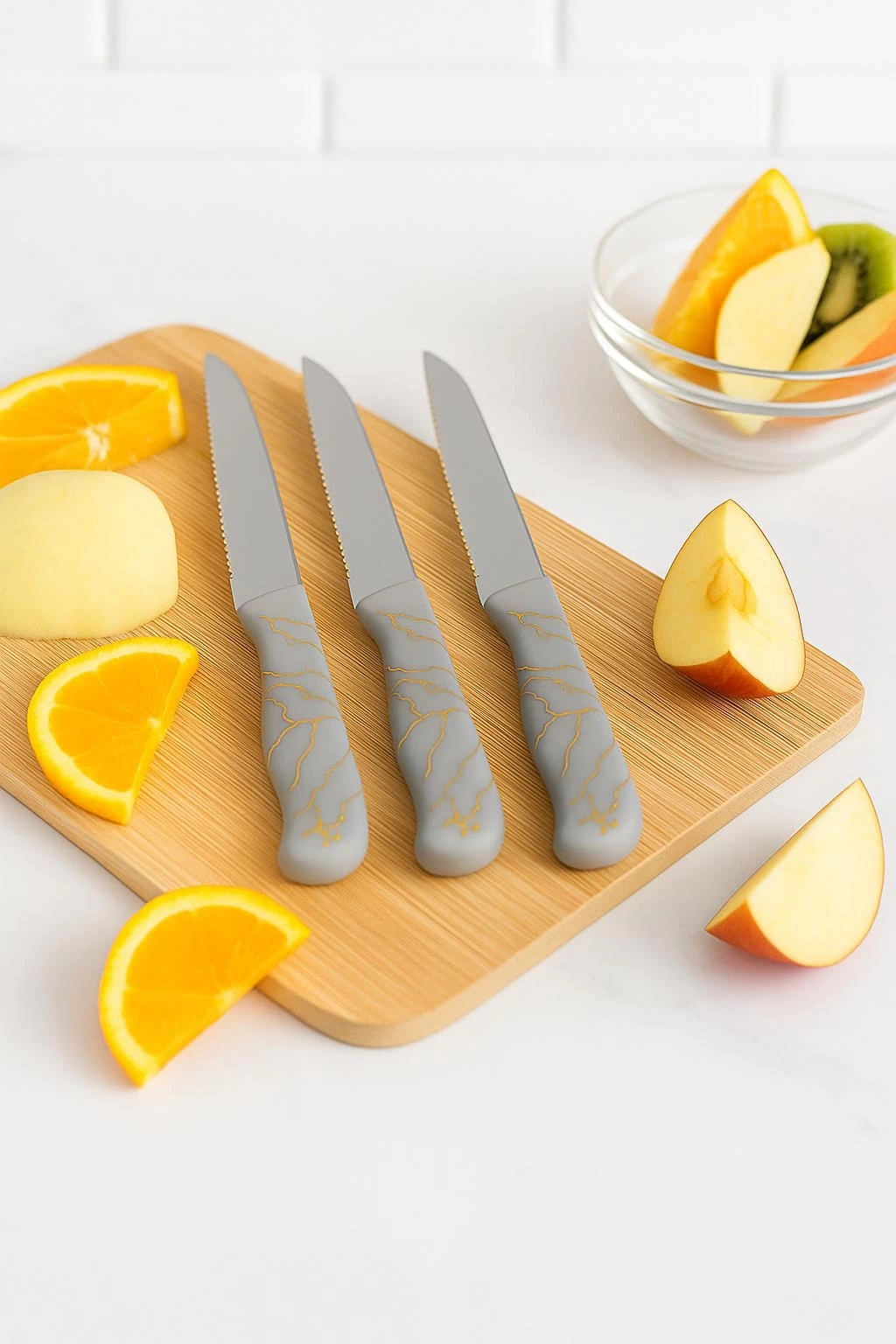 Ürün Hikayesi: Sofralarınıza modern bir dokunuş katacak bu 3’lü paslanmaz çelik meyve bıçak seti, mermer desenli saplarıyla hem şık hem de kullanışlıdır. Keskin dişli yapısı sayesinde meyvelerinizi kolayca dilimleyebilir, günlük kullanımda veya özel davetlerde pratiklik sağlar.