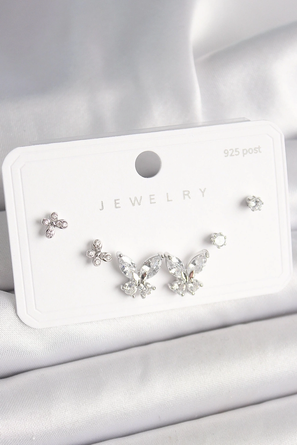 • 925 Ayar Gümüş Çivi Pirinç Zirkon Taşlı Kelebek Model Kadın Küpe Seti