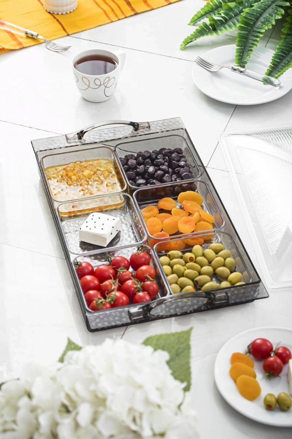 Kırılmaya dayanıklı 6 kaseli akrilik tek kapaklı büyük kahvaltılık; masada düzen severlerin, pratik ve hızlı kahvaltı yapmak isteyenlerin en büyük tercihi.