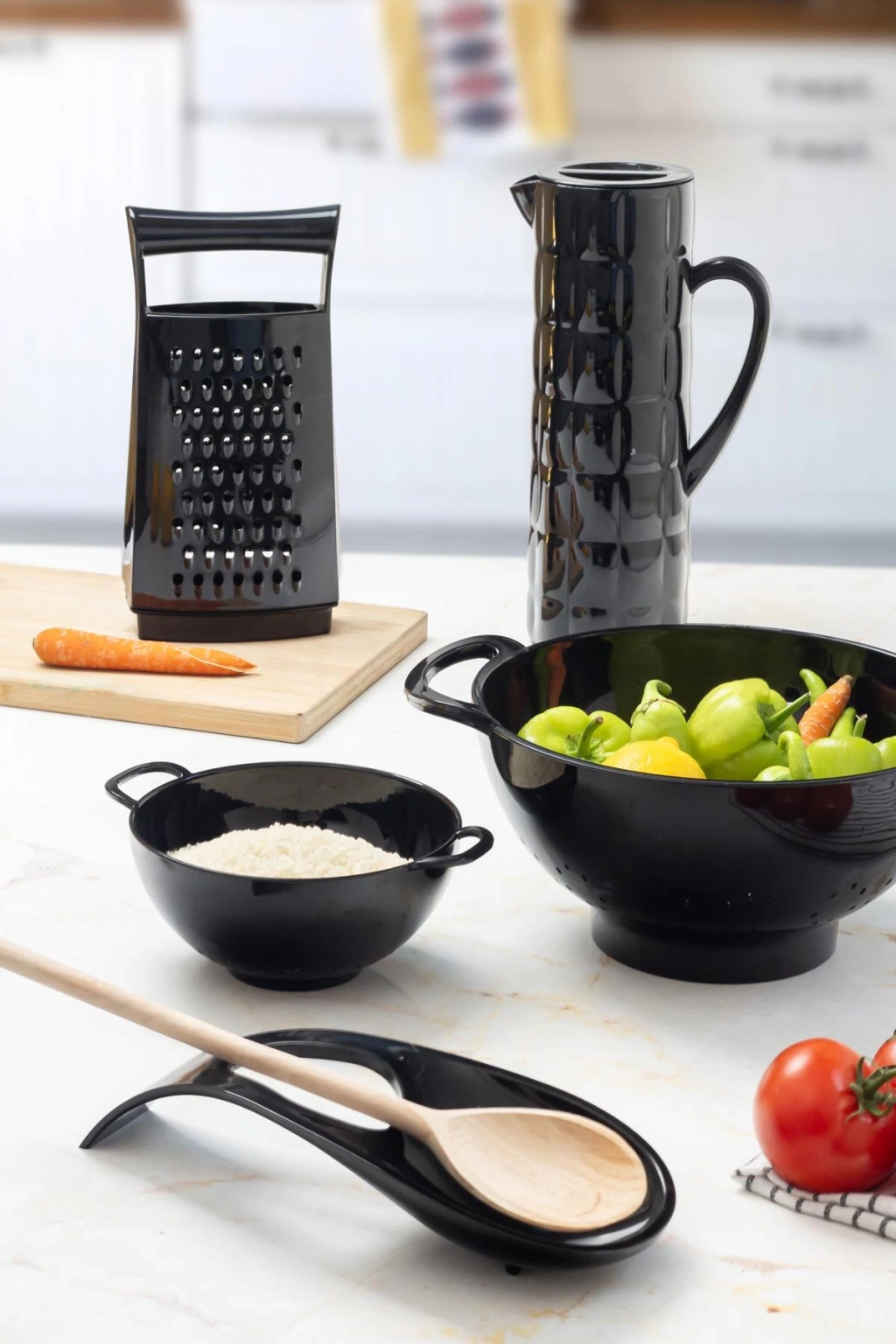 Mutfakta ve sofrada hem şık hem işlevsel hem de kırılmaz yapısı ile akrilik sürahi & rende & süzgeç & mini süzgeç ve kaşıklık seti günlük hayatta