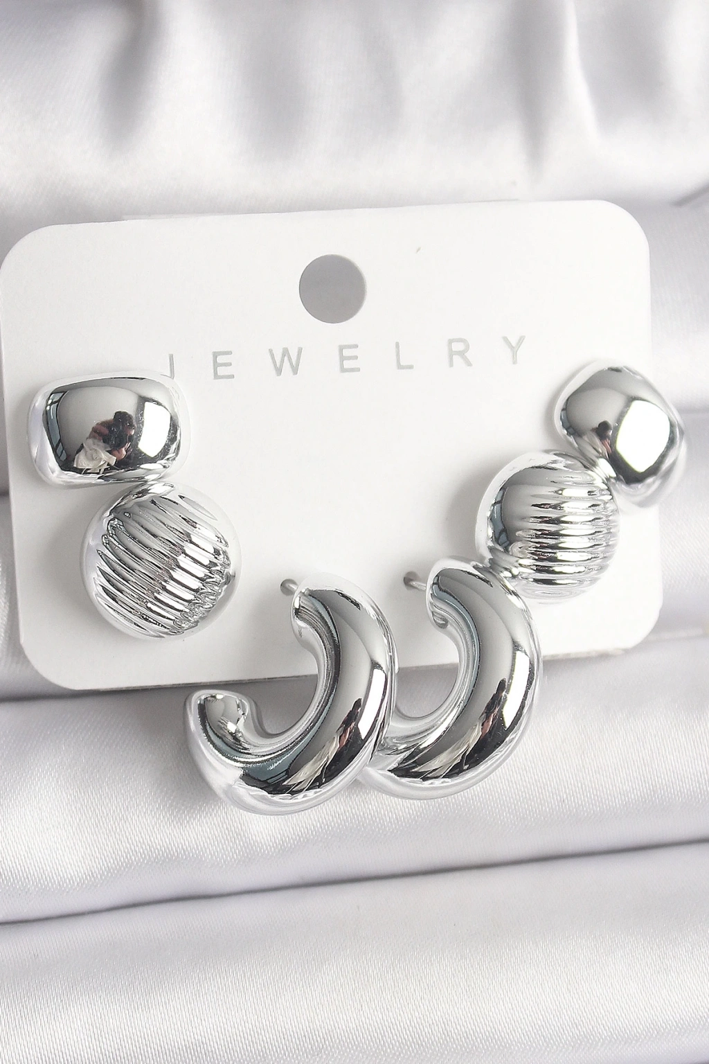 • Gümüş Renk İşlemeli Daire Halka Model CCB Platik Kadın Küpe Seti