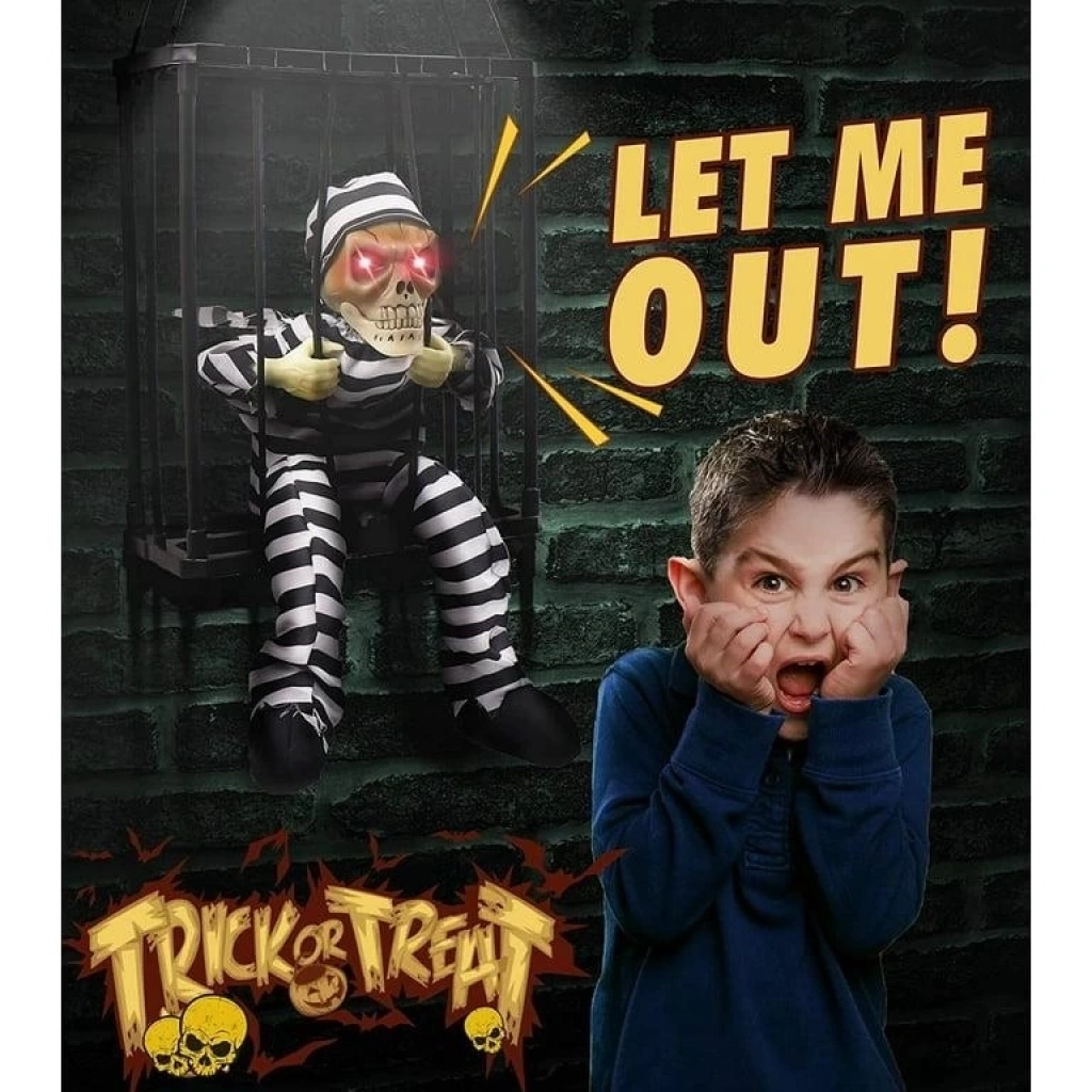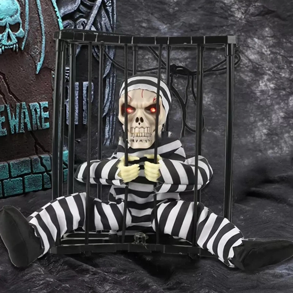 Hareketli Sesli Sensörlü Mahkum Görünümlü Kuru Kafa İskelet Dekorasyon 22x27 Cm