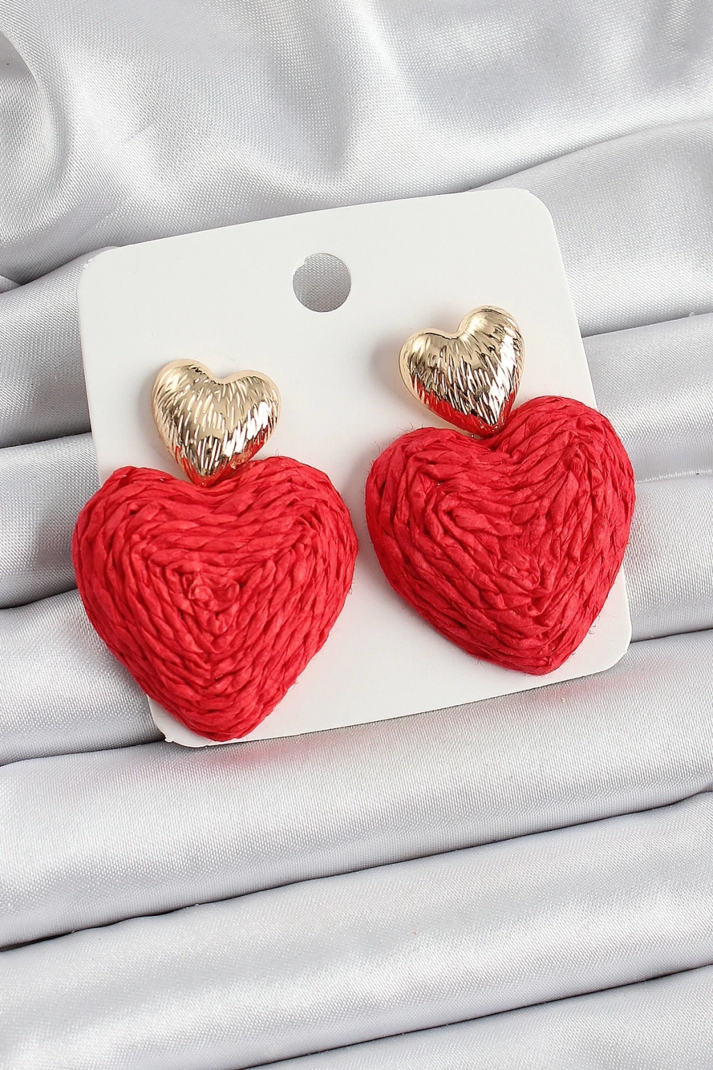 • Kırmızı Kalp Figürlü Hasır Örgü Model Gold Renk Kadın Küpe