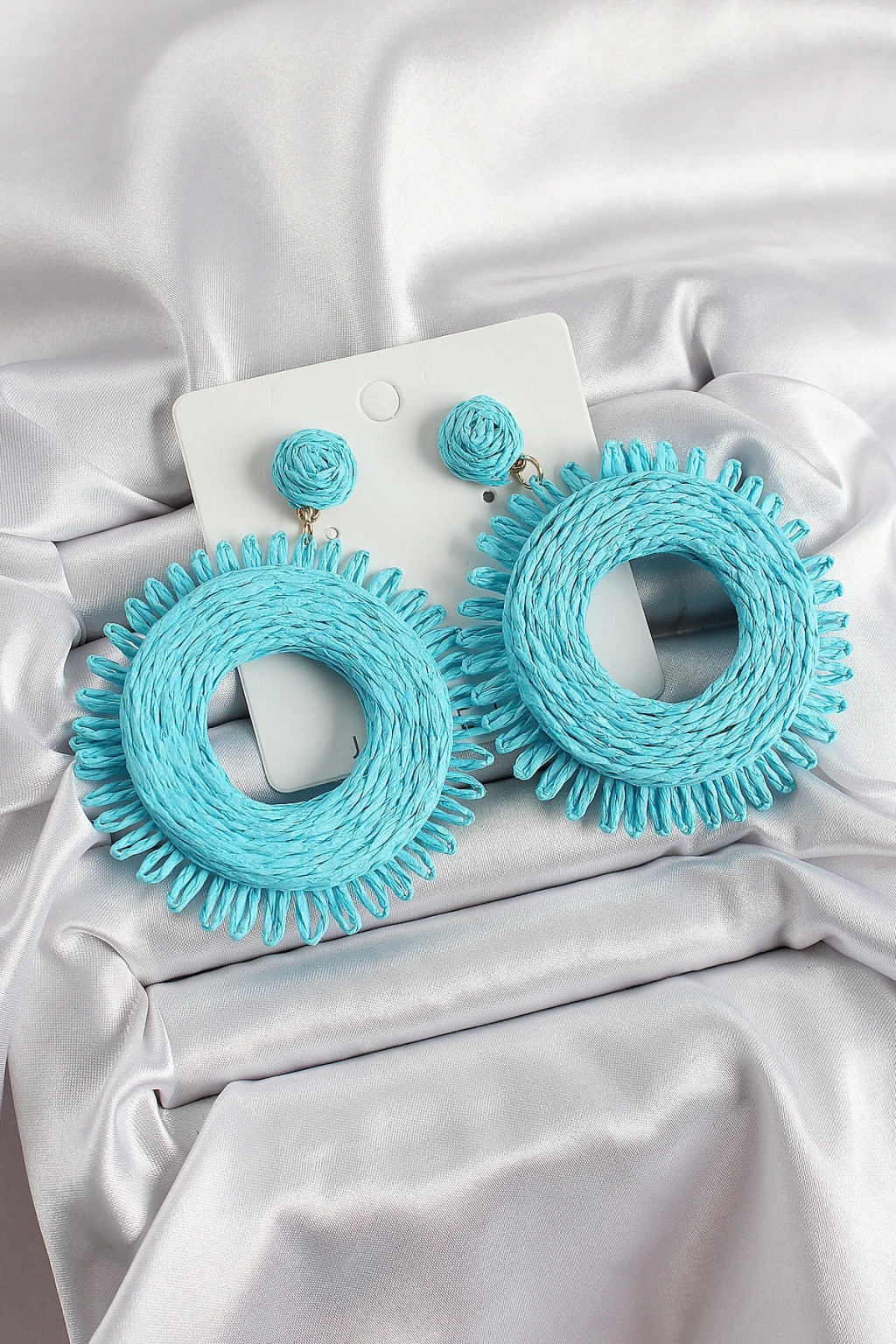 • Mavi Püsküllü Halka Figürlü Hasır Örgü Model Gold Renk Kadın Küpe