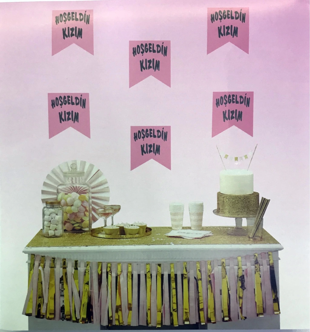 • Pembe Üzeri Gümüş Renk Hoşgeldin Kızım Bayrak Süs