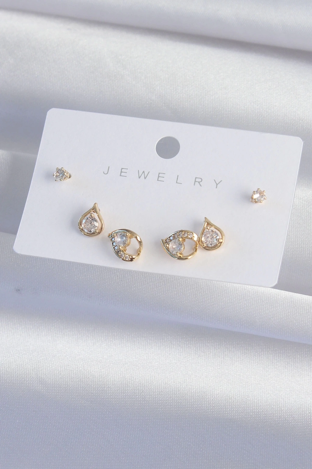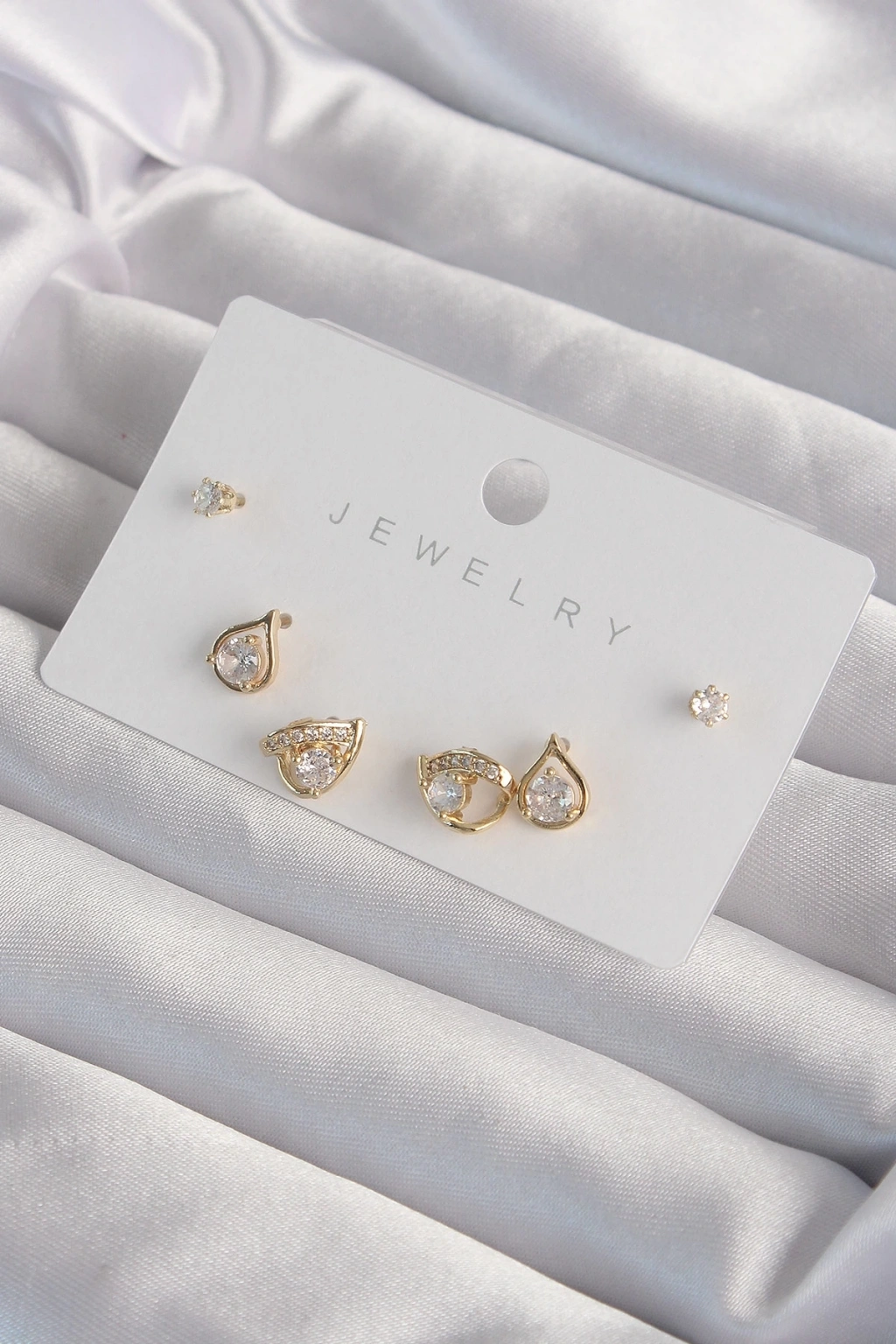 • Pirinç Gold Renk Zirkon Taşlı Damla Model Küpe Seti