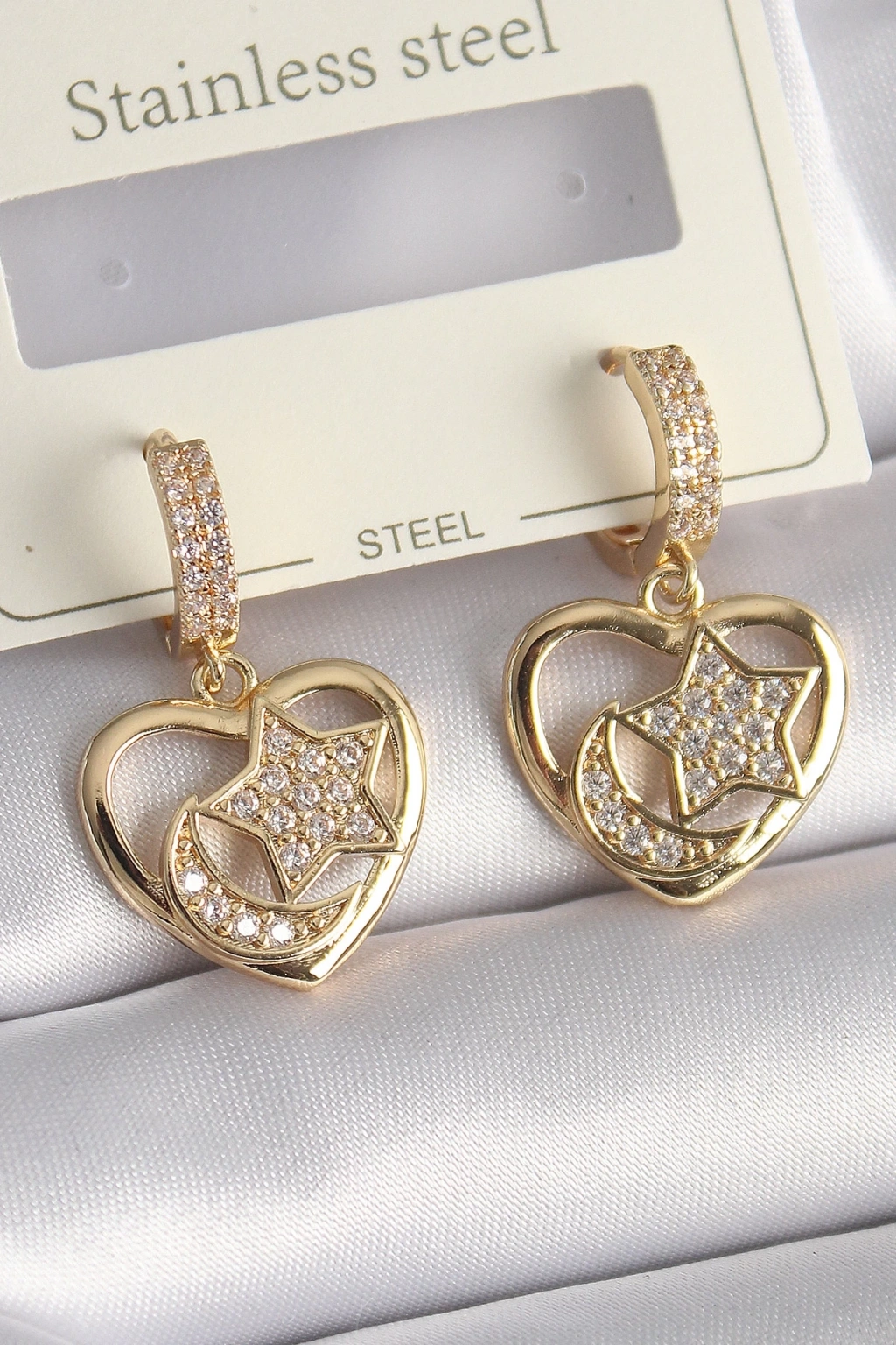 • Pirinç Gold Renk Zirkon Taşlı Kalp Model Ay Yıldız İşleme Kadın Küpe