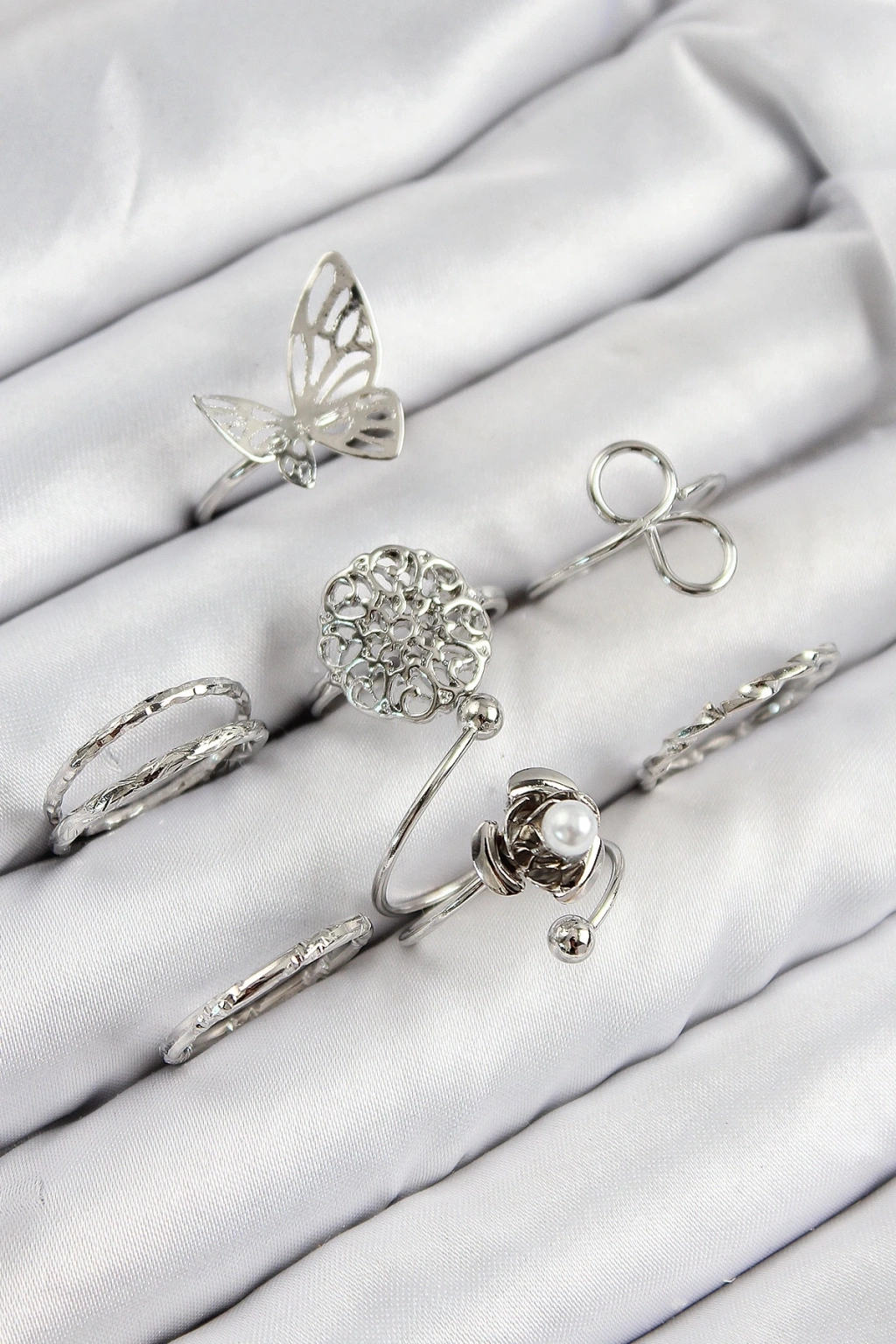 • Pirinç Gül Kelebek Model Gümüş Renk Kadın Yüzük Kombin Set