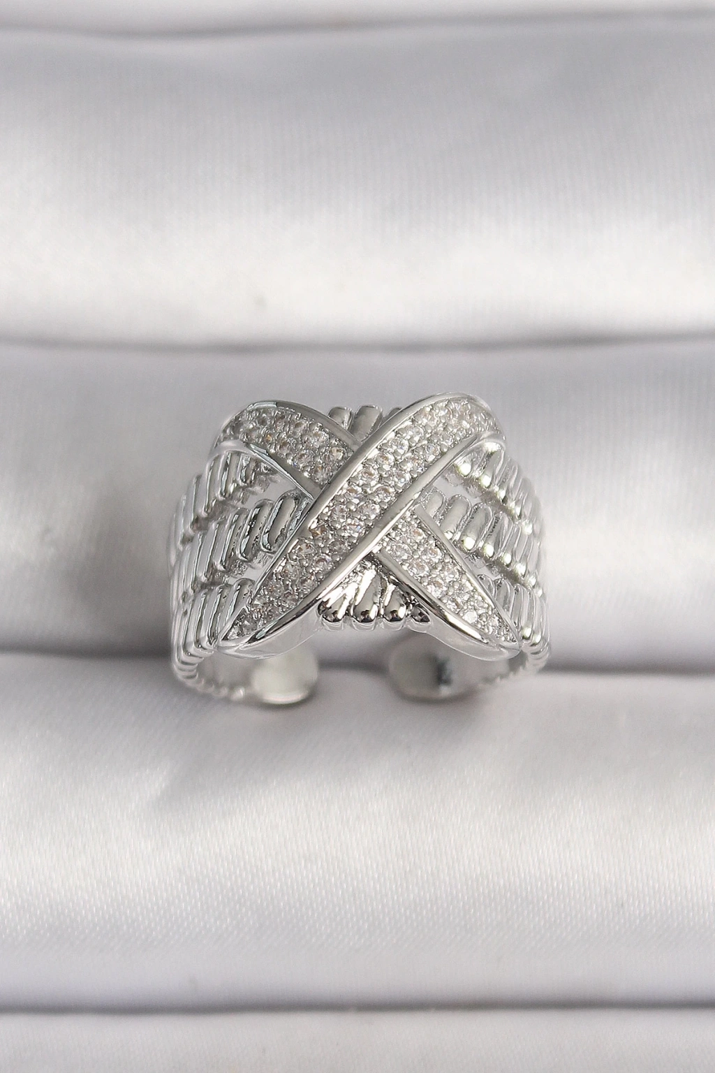 • Pirinç Gümüş Renk Ayarlanabilir Zirkon Taşlı X Model Kadın Yüzük
