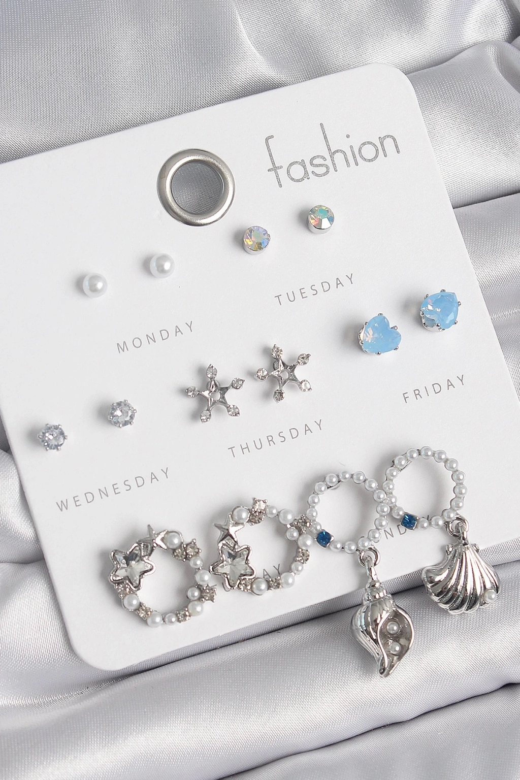 • Pirinç Gümüş Renk İncli Zirkon Taşlı Halka Figür Yıldız Detay 7 Çift Kadın Küpe Seti
