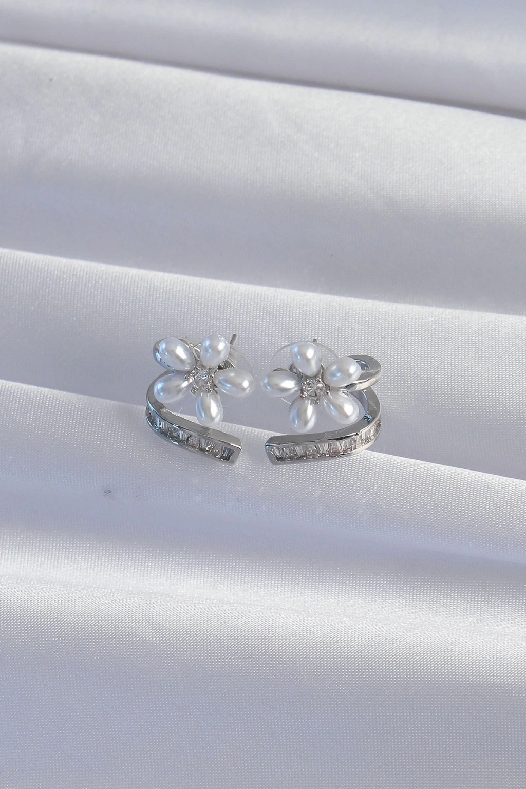 • Pirinç Gümüş Renk Zirkon Taşlı Kıvrımlı İnci Çiçek Küpe