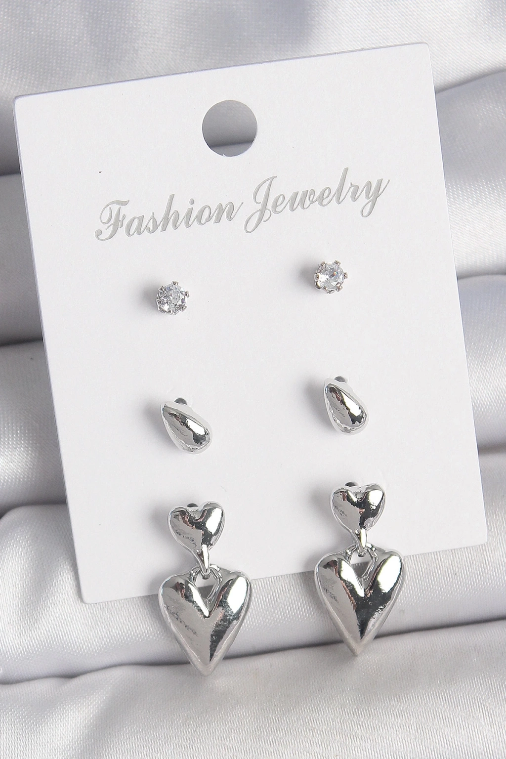 • Pirinç Gümüş Renk Zirkon Taşlı Sallantılı Kalp Model 3 Çift Kadın Küpe Seti