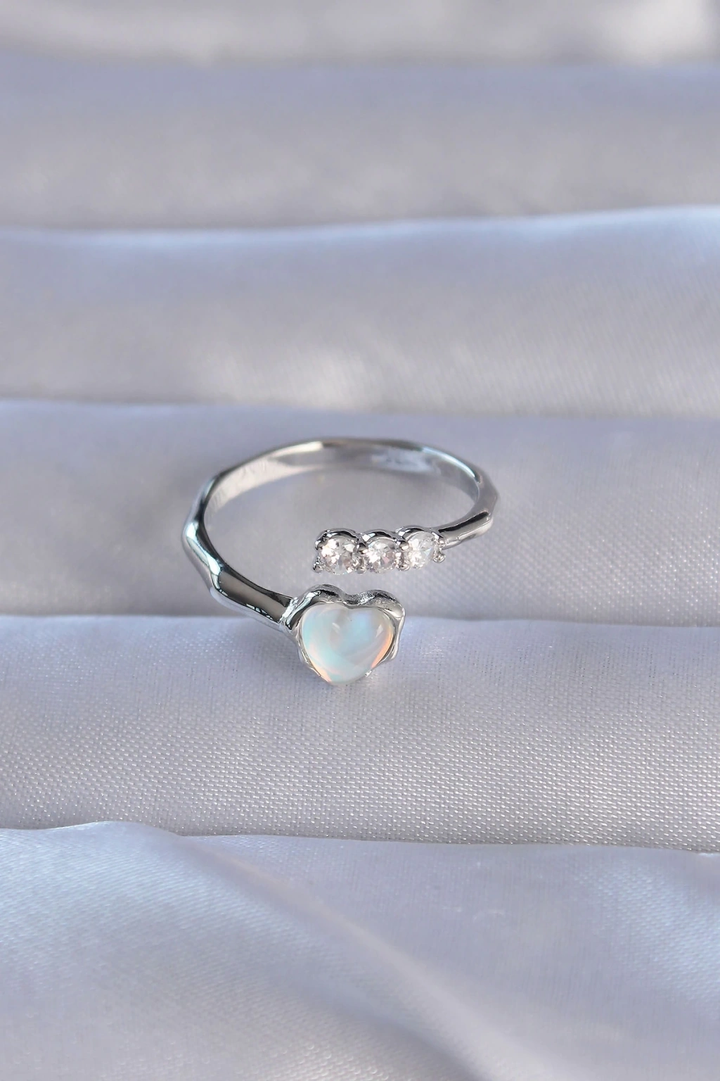 • Pirinç Gümüş Renk Zirkon Taşlı Sedefli Kalp Model Ayarlanabilir Yüzük