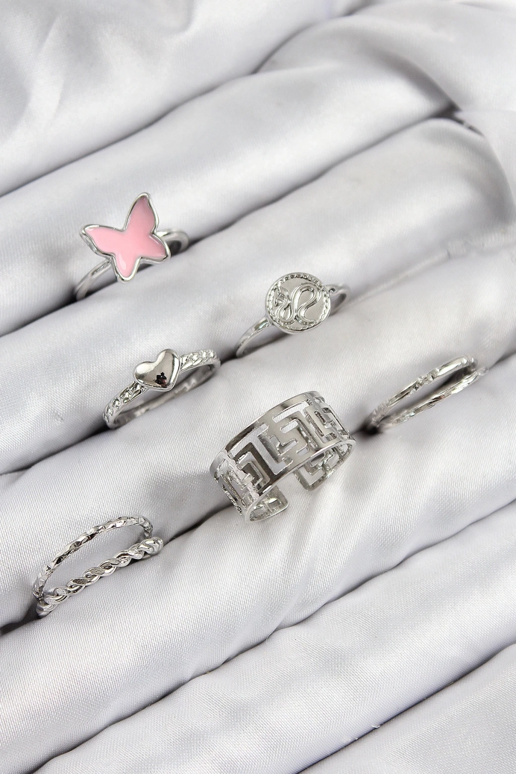 • Pirinç Kelebek Ve Kalp Model Gümüş Renk Kadın Yüzük Kombin Set