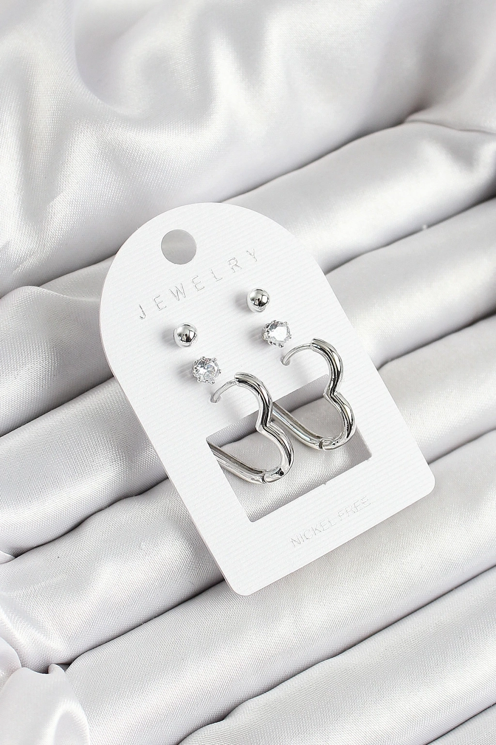 • Pirinç Zirkon Taş Ve Kalp Figürlü Gümüş Renk 3'lü Çift Kadın Küpe Set