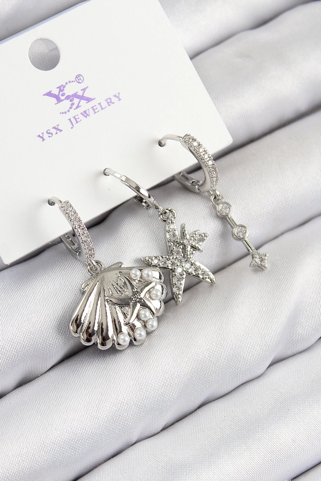 • Pirinç Zirkon Taşlı 3'lü Yıldız Ve İstiridye Model Gümüş Renk Kadın Küpe