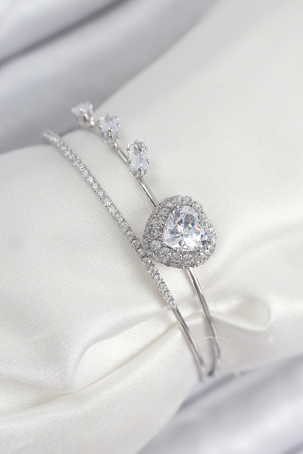 • Pirinç Zirkon Taşlı Kalp Model Gümüş Renk Kadın Bileklik