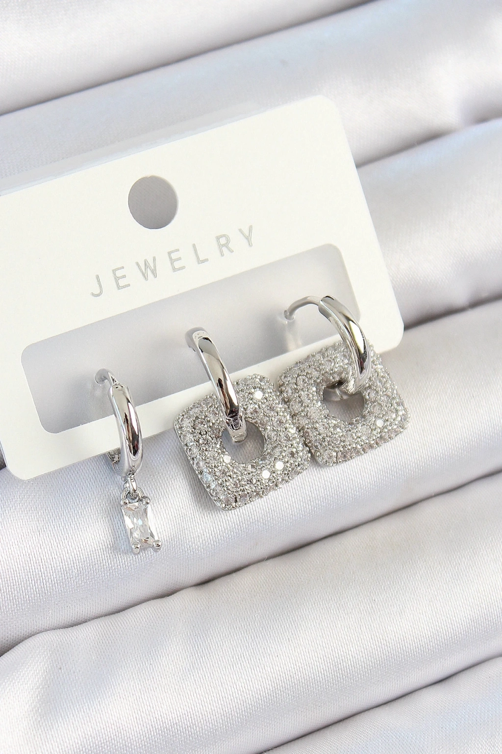 • Pirinç Zirkon Taşlı Kare Model Gümüş Renk 3'lü Çift Kadın Küpe Set
