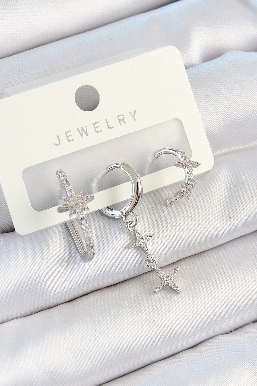 • Pirinç Zirkon Taşlı Kelebek Ve Sallantılı Yıldız Model Gümüş Renk 3'lü Çift Kadın Küpe Set