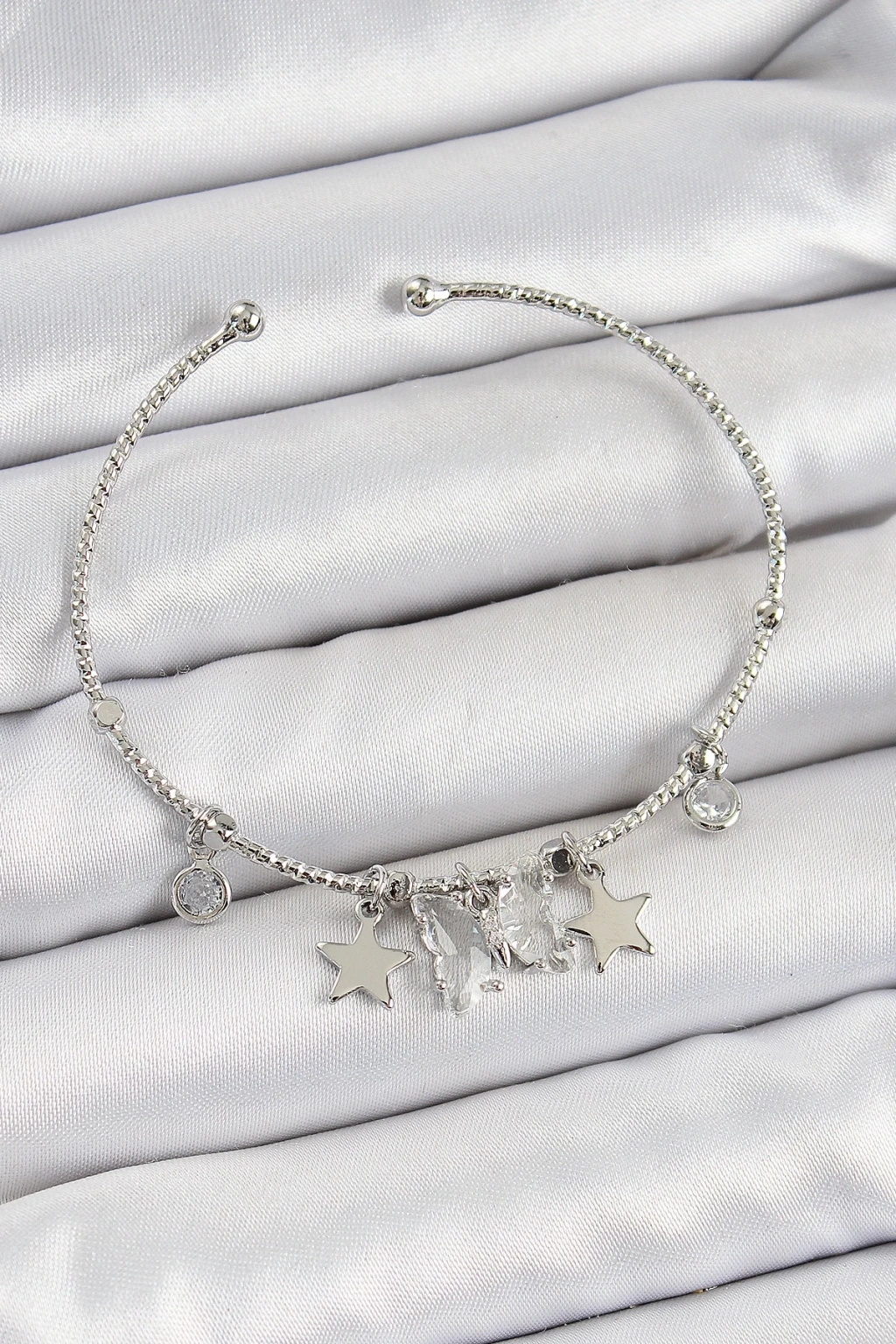 • Pirinç Zirkon Taşlı Kelebek Ve Yıldız Model Gümüş Renk Charm Bileklik