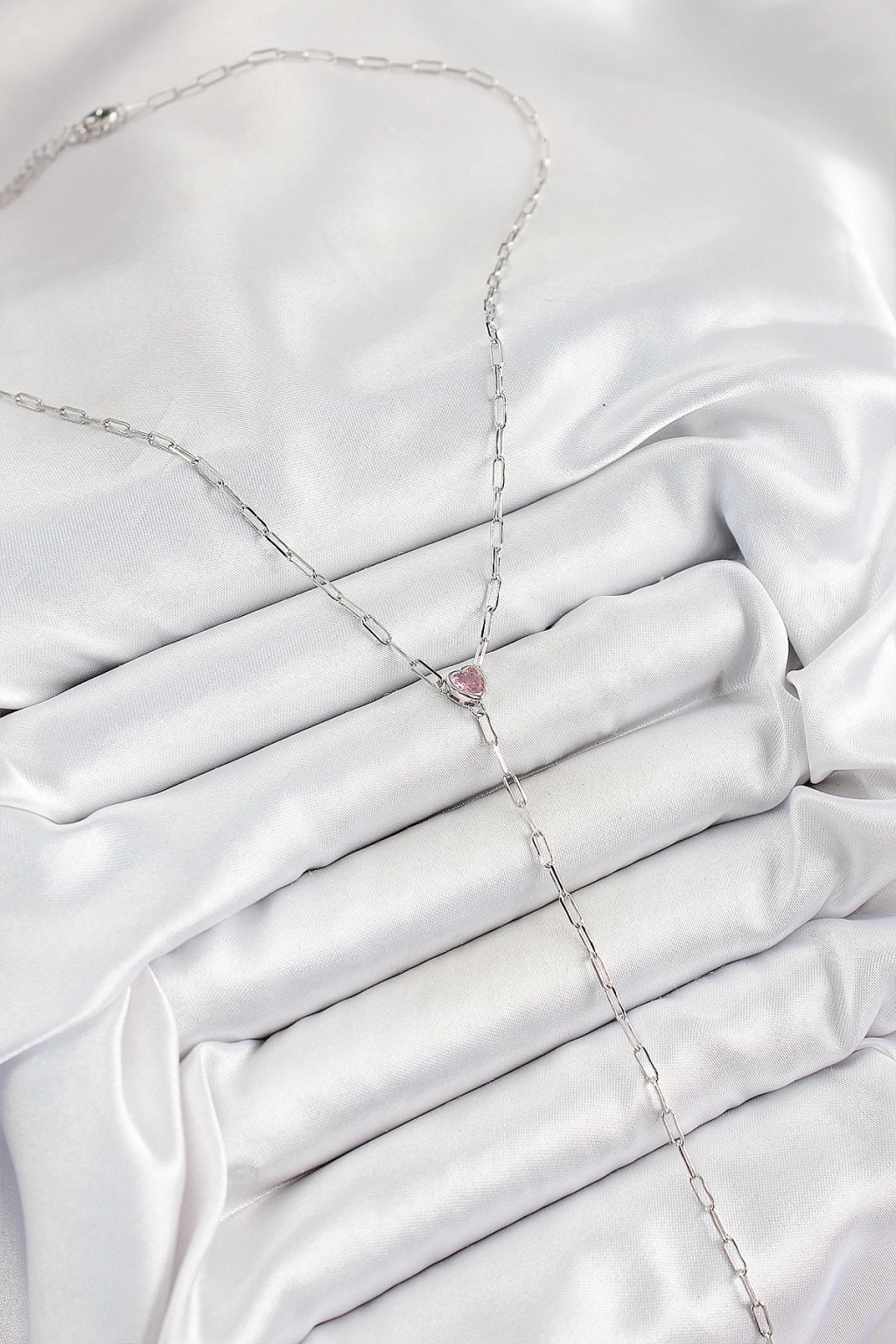 • Pirinç Zirkon Taşlı Pembe Kalp Figürlü Y Model Gümüş Renk Kadın Kolye