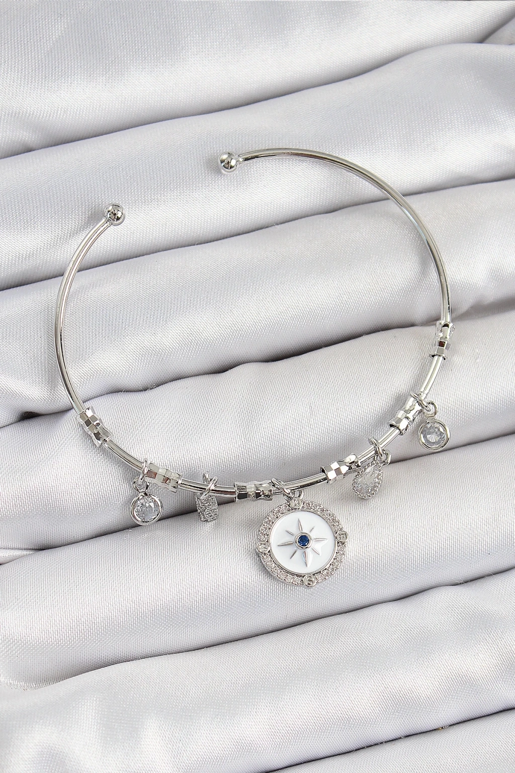 • Pirinç Zirkon Taşlı Pusula Model Gümüş Renk Charm Bileklik