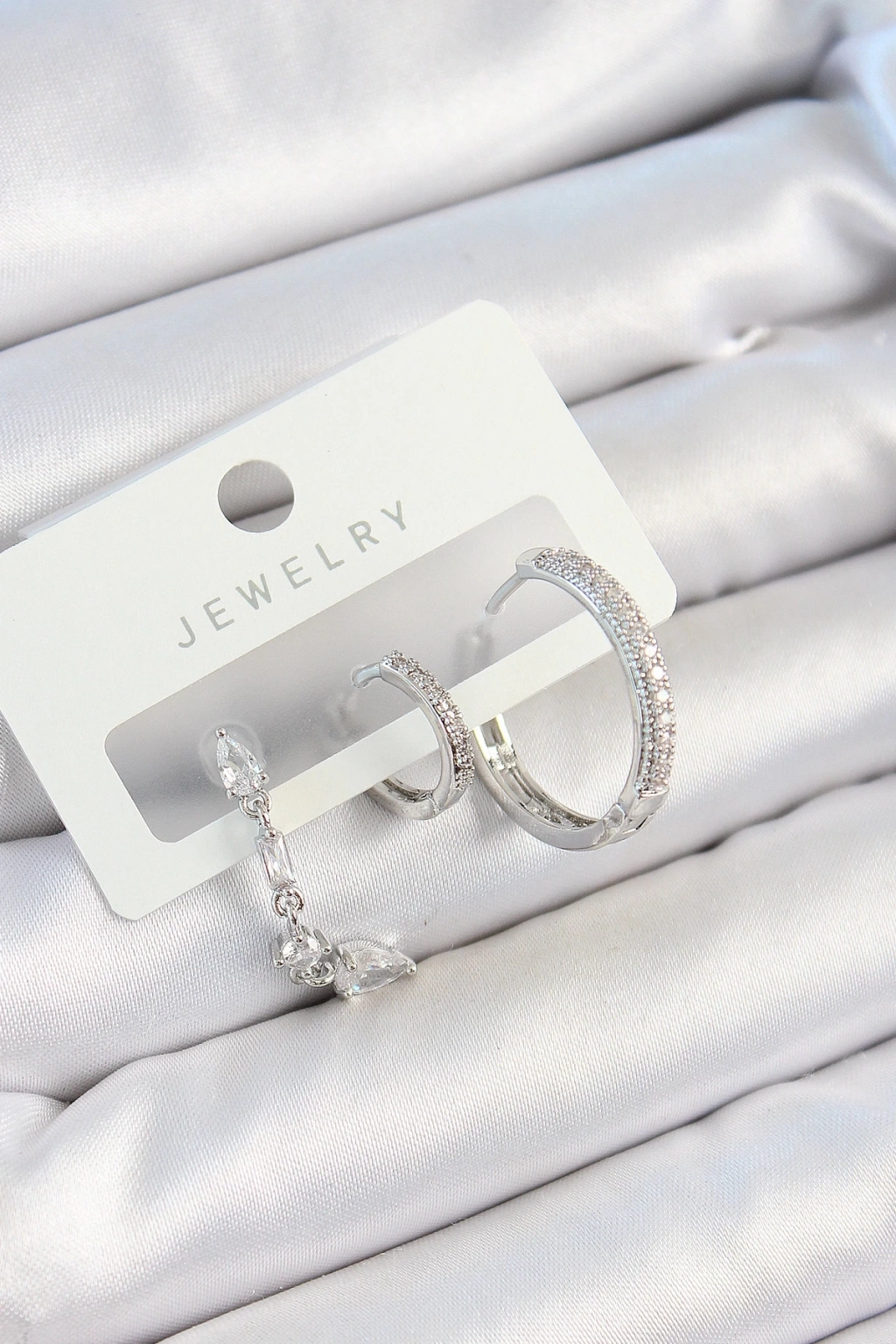• Pirinç Zirkon Taşlı Sallantılı Model Gümüş Renk 3'lü Çift Kadın Küpe Set