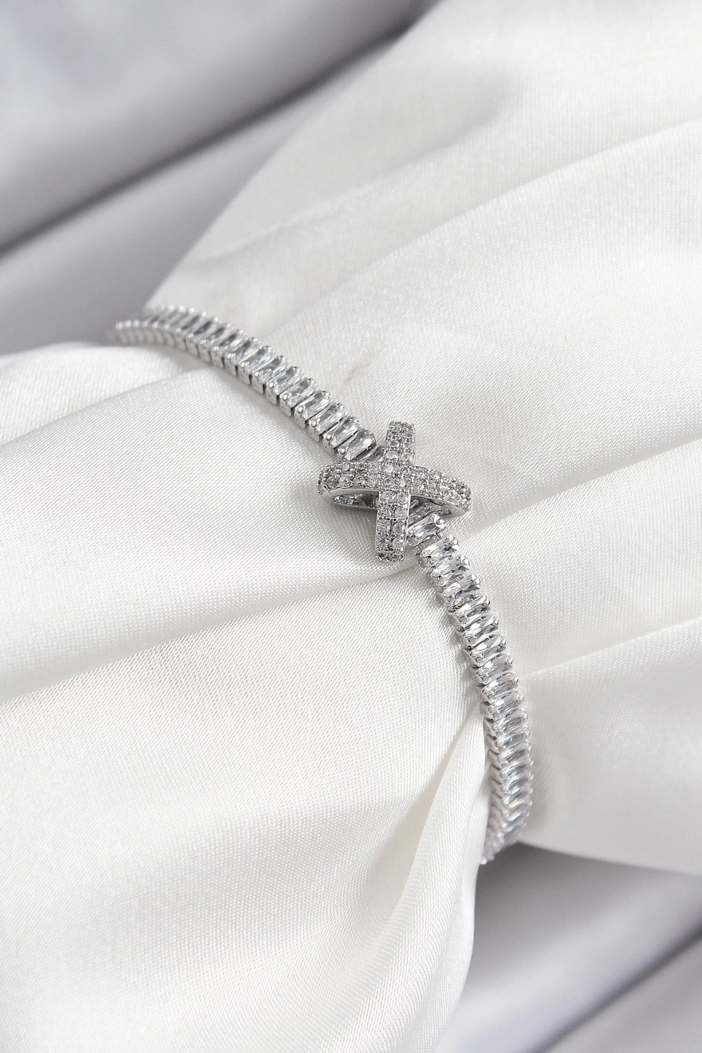 • Pirinç Zirkon Taşlı X Detaylı Su Yolu Model Gümüş Renk Asansörlü Kadın Bileklik