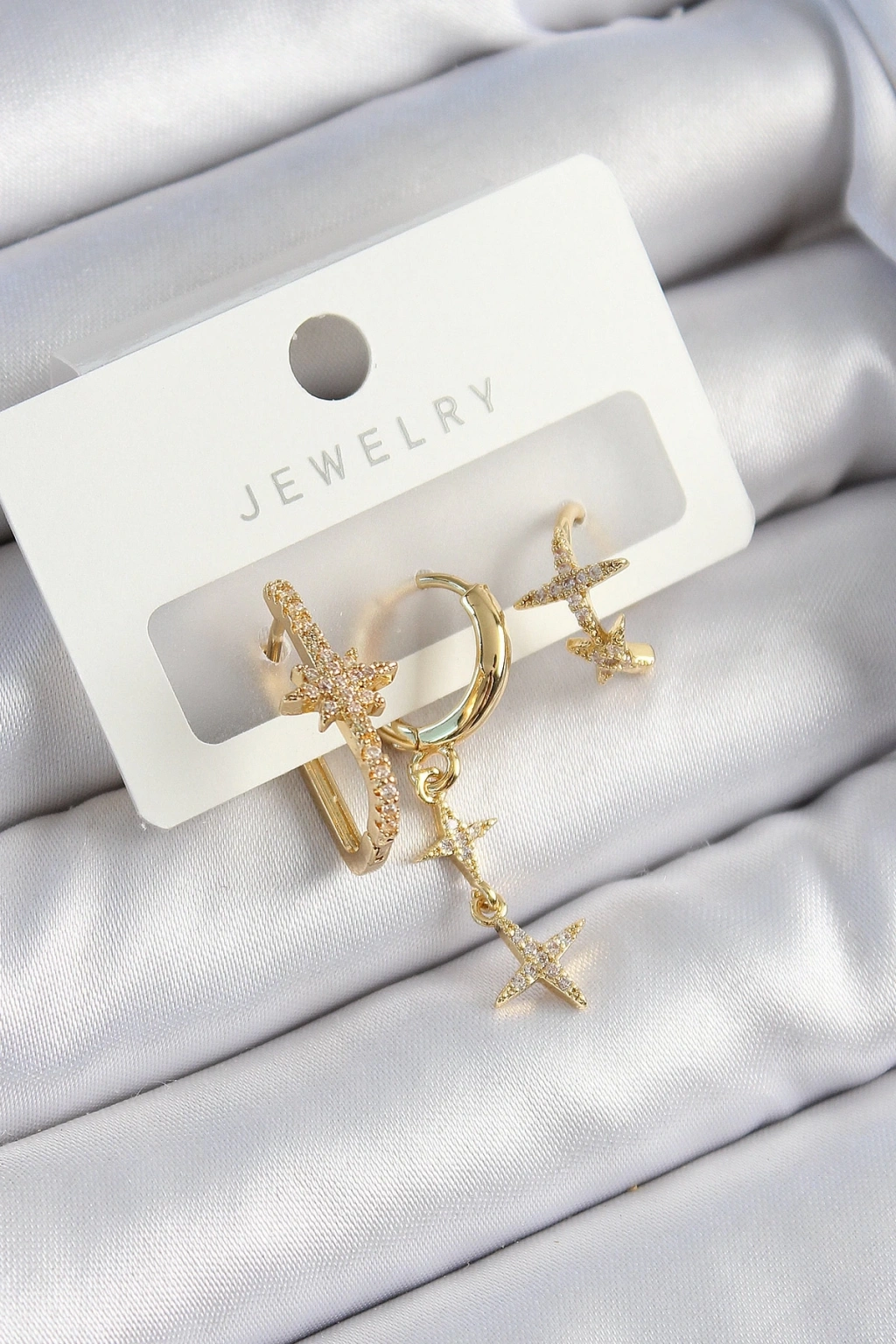 • Pirinç Zirkon Taşlı Yıldız Model Gold Renk 3'lü Çift Kadın Küpe Set