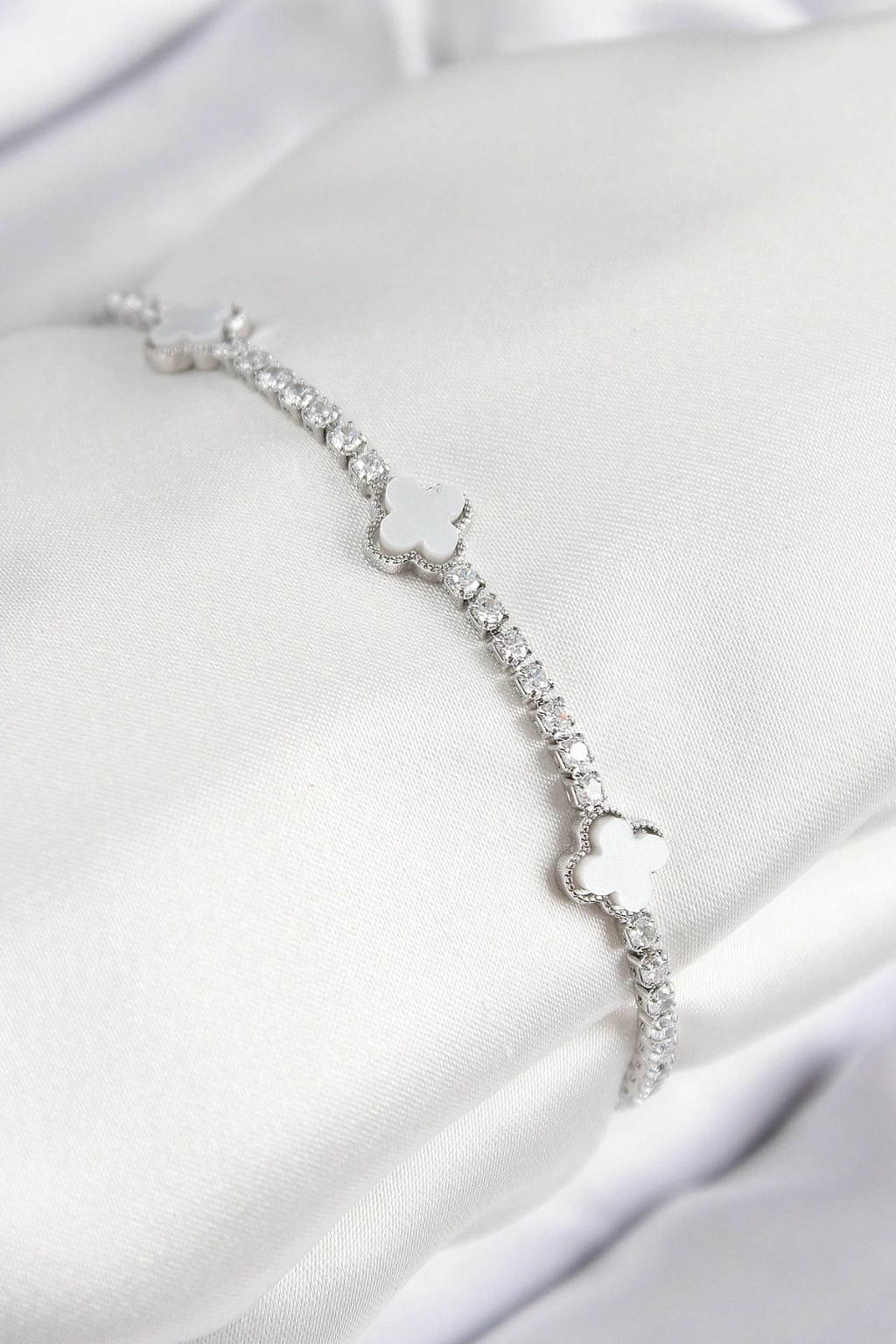 • Pirinç Zirkon Taşlı Yonca Model Gümüş Renk Kadın Bileklik