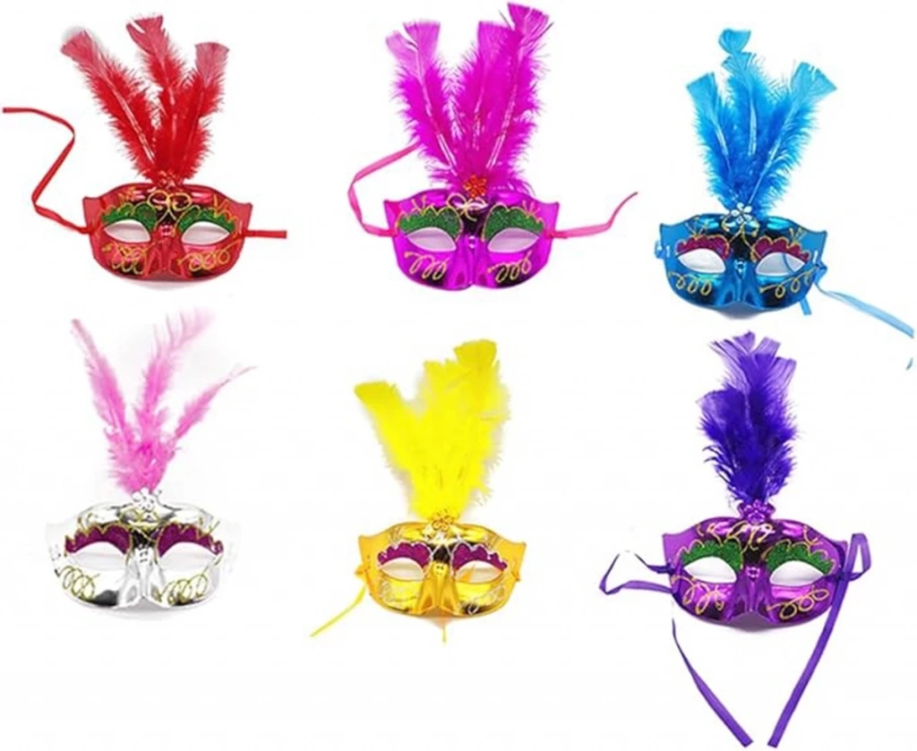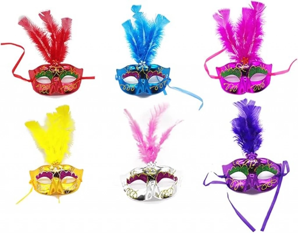 Renkli Tüylü Venedik Parti Maskesi Karışık Renk 12 Adet