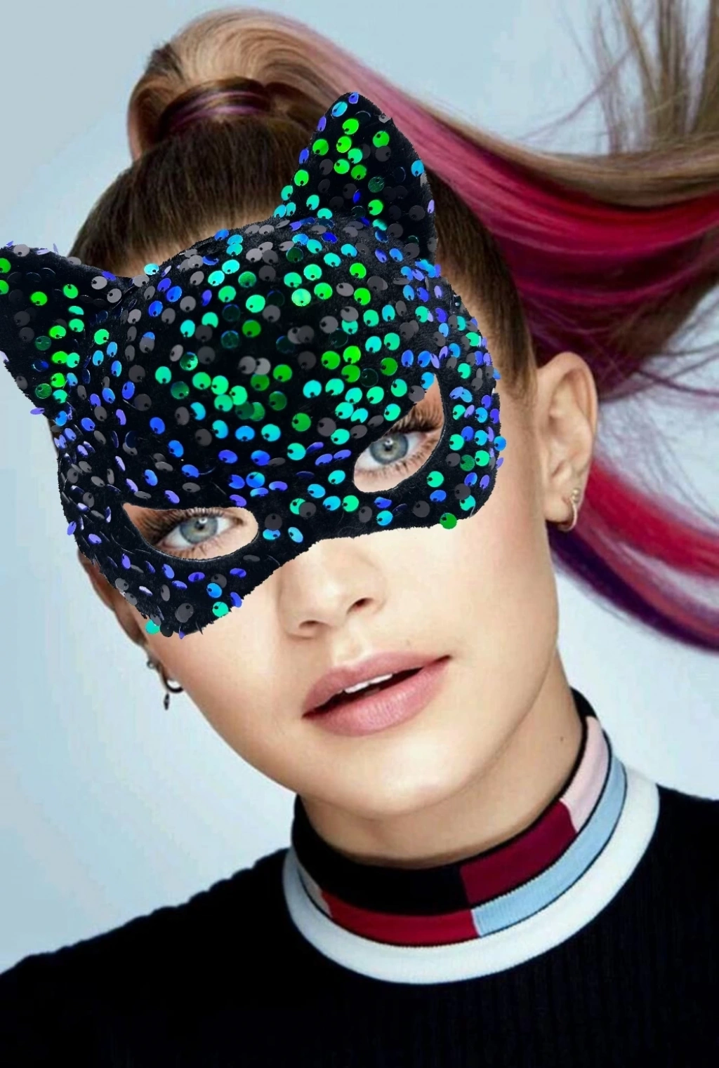 Siyah Kadife Kumaş Üzerine Mavi Yeşil Payetli Pullu Parti Maskesi 16x14 Cm